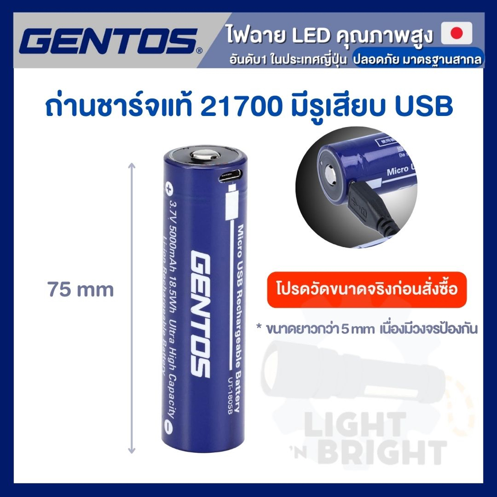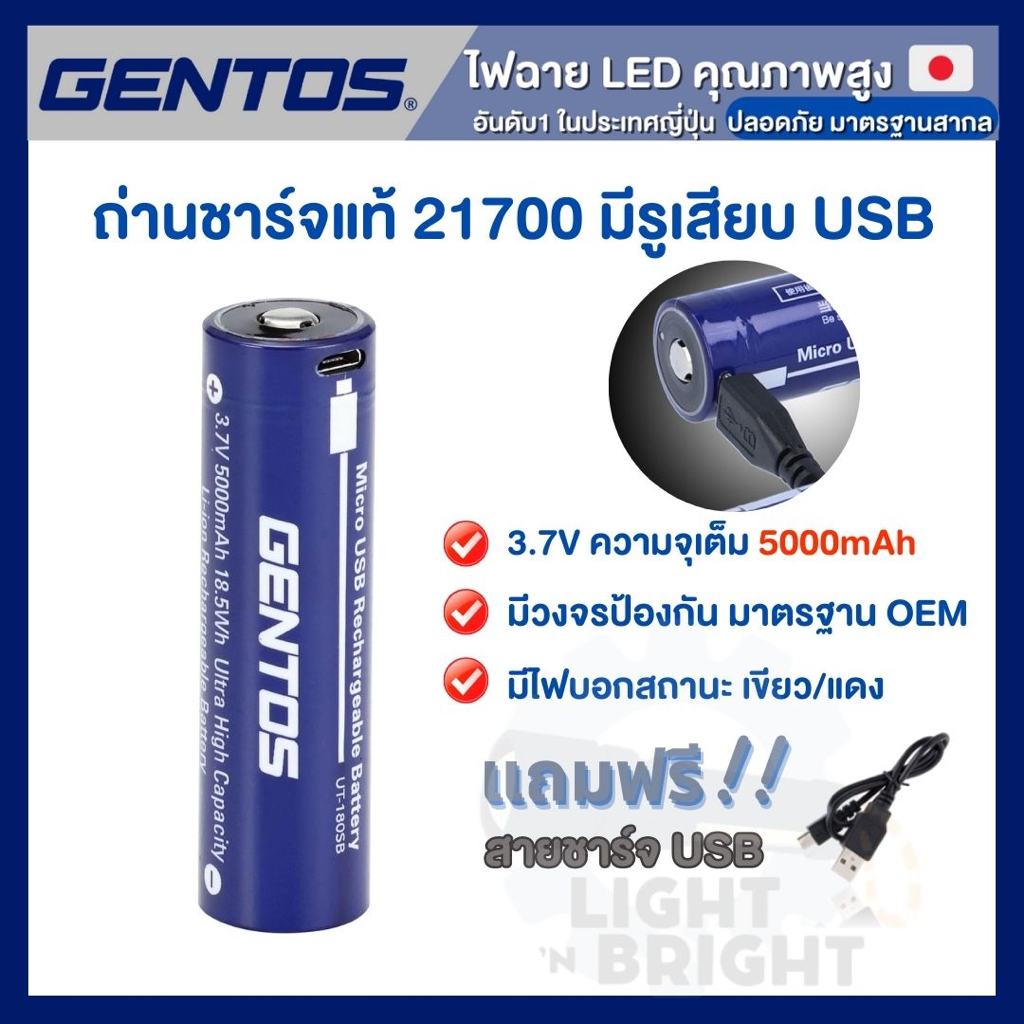 GENTOS ถ่านชาร์จญี่ปุ่น 21700 หัวนูน 5000mAh 3.7V มีรูเสียบ USB ไม่ต้องพกแท่นชาร์จ มีวงจรป้องกัน ปลอดภัยสูง ของแท้100%
