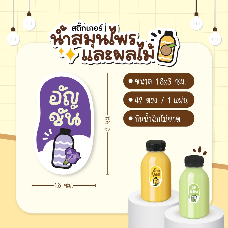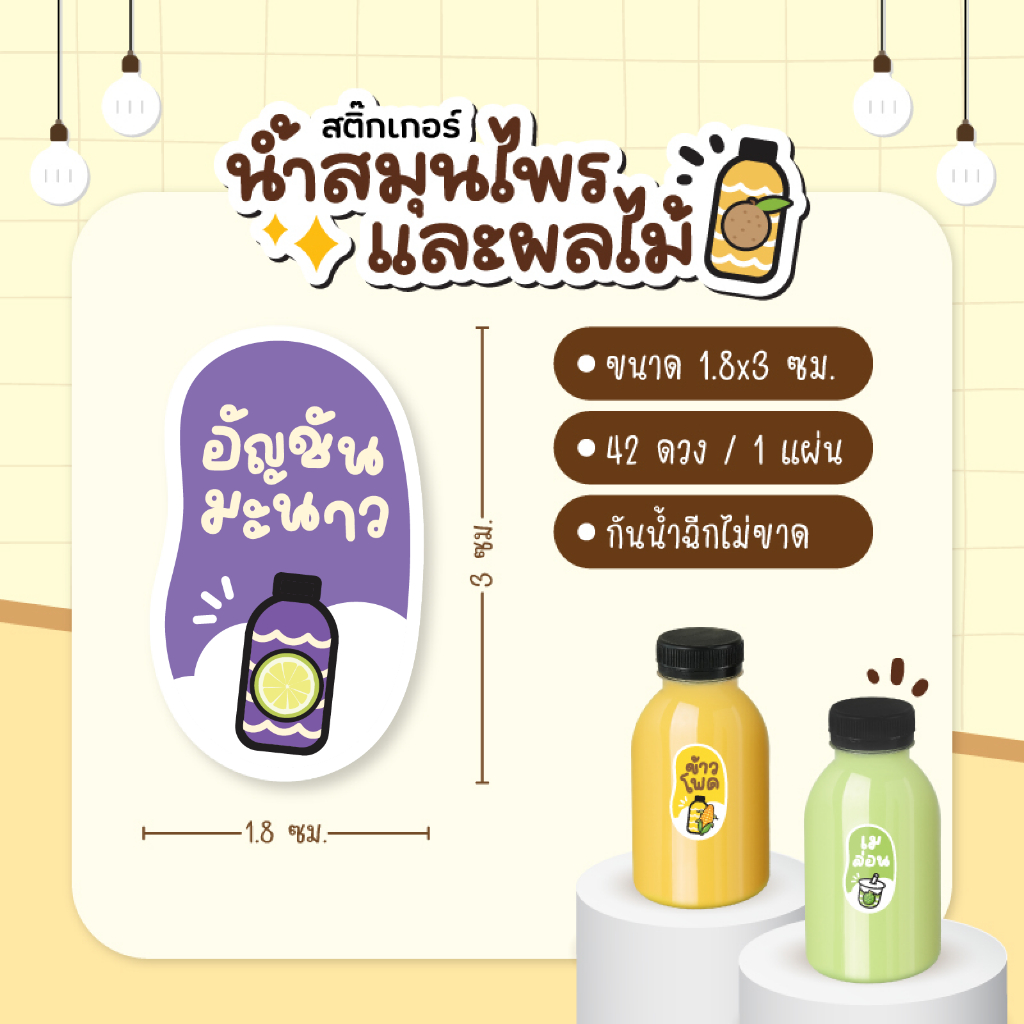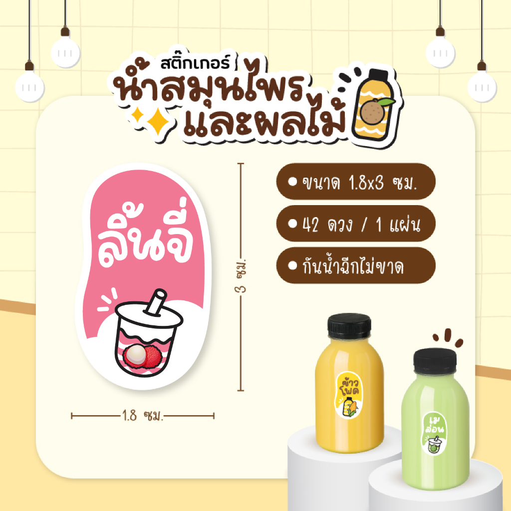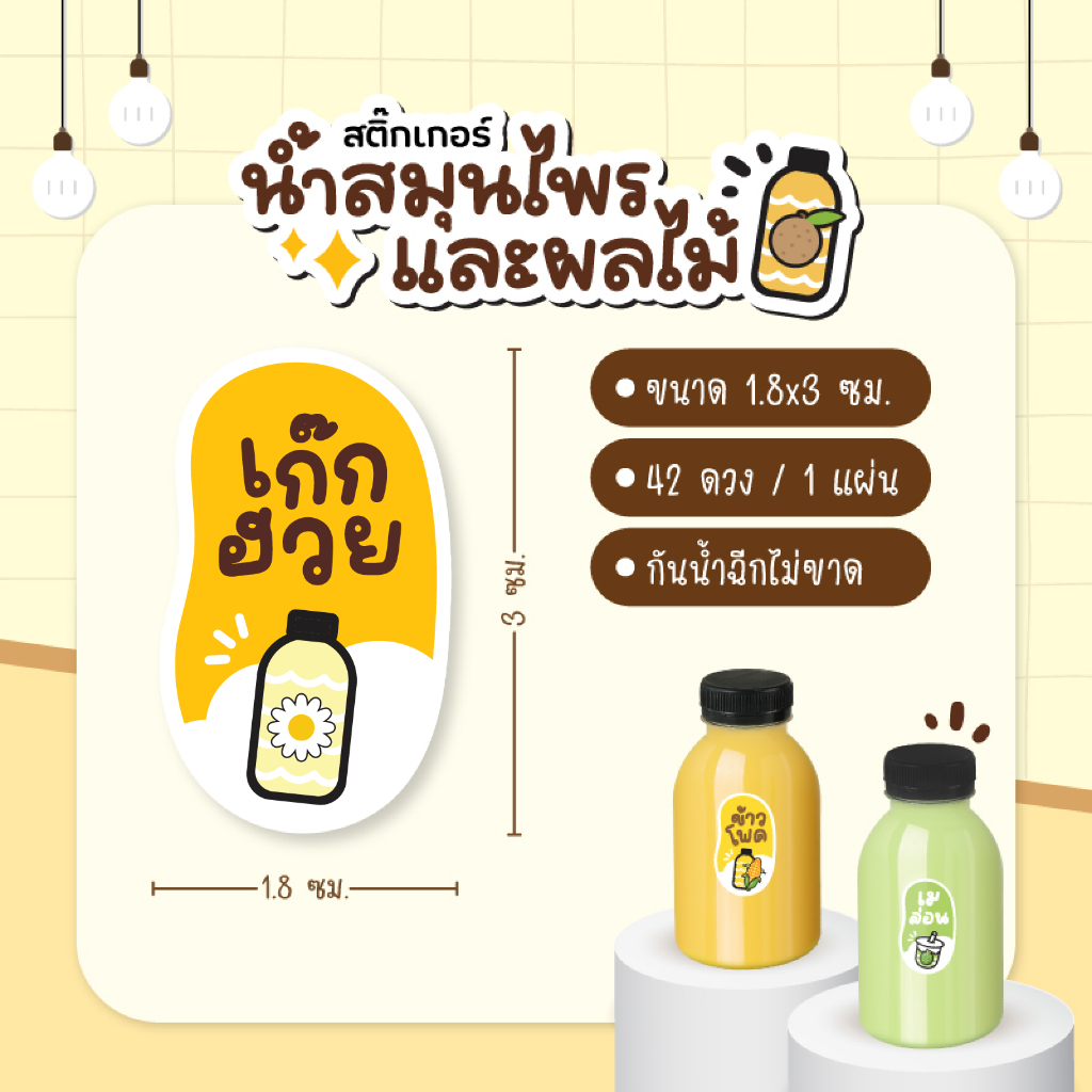 สติกเกอร์นำ้สมุนไพร สติกเกอร์น้ำผลไม้ ลำไย เก๊กฮวย มะพร้าว ส้ม ลำไย 42 ดวง มีให้เลือกกว่า 20 แบบ