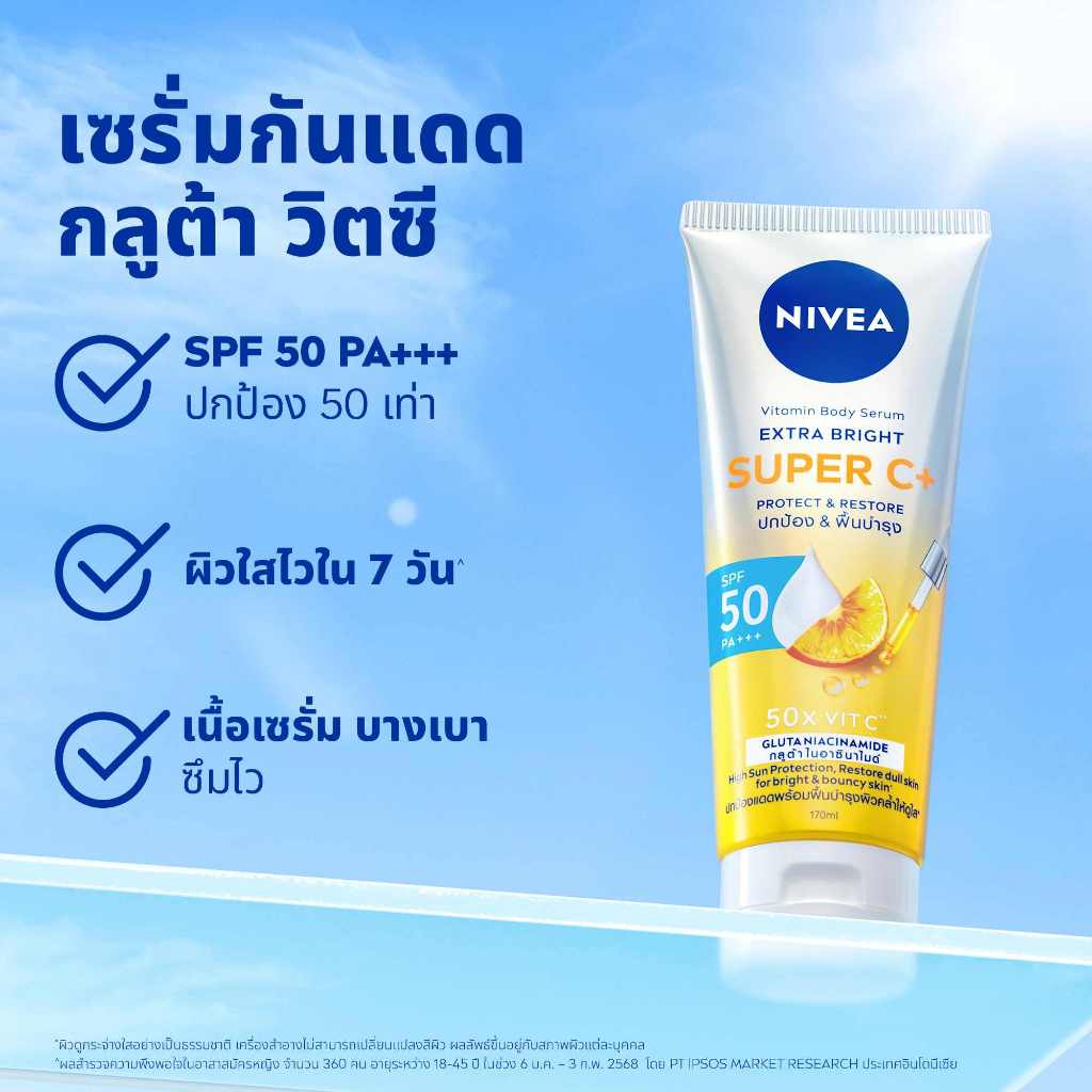 เซรั่มบำรุงผิวกายจาก Nivea รุ่น Super 10 คือความพรีเมียมของการฟื้นฟูผิวจริงๆ ครับ นวัตกรรม 'Triple Bright Power' ที่ผสาน 3 สารทรงพลังอย่างวิตามินซีบริสุทธิ์ 95% กลูต้าไธโอน และไนอาซินาไมด์ เข้าด้วยกัน ไฮไลท์พรีเมียมคือประสิทธิภาพในการบูสต์ผิวให้ดูกระจ่างใสภายใน 7 วันและช่วยลดเลือนจุดด่างดำฝังลึกได้อย่างมีประสิทธิภาพสูงสุด พร้อมการปกป้องผิวจากแสงแดดด้วย SPF50 PA+++ เนื้อเซรั่มบางเบาซึมไวไม่เหนียวเหนอะหนะและให้กลิ่นหอมสดชื่นเป็นเอกลักษณ์ บรรจุภัณฑ์สวยงามและการจัดส่งทำได้รวดเร็ว มั่นใจในคุณภาพแบรนด์ Nivea ที่ผ่านการทดสอบโดยผู้เชี่ยวชาญด้านผิวพรรณ คุ้มค่าและพรีเมียมที่สุดสำหรับการดูแลผิวให้สว่างใสและสุขภาพดีระดับพรีเมียมครับ