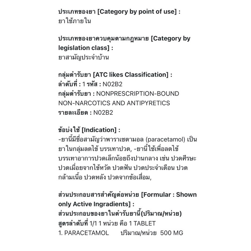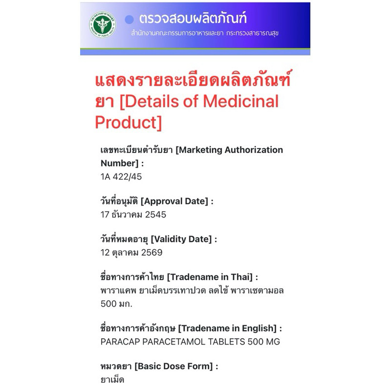 Paracap พาราแคพ พาราเซตามอล 500 มก 1 แผง