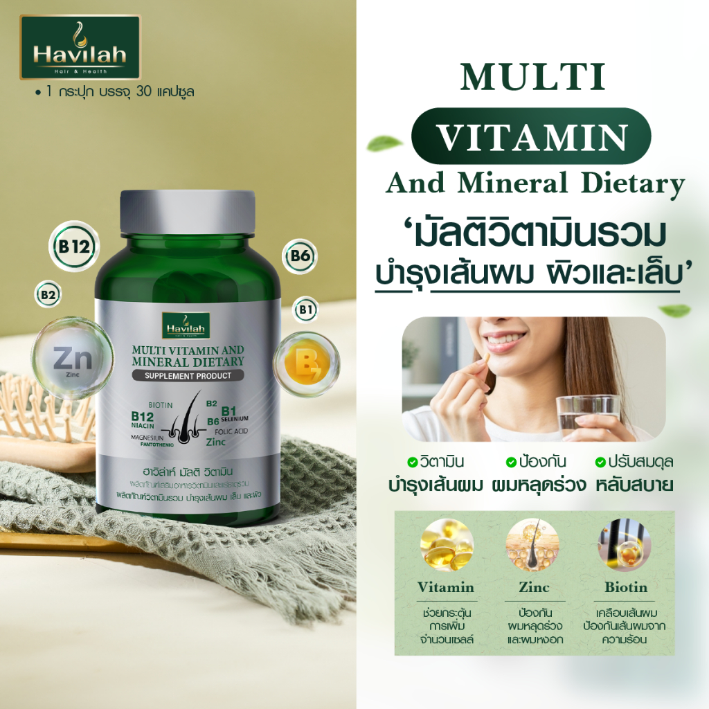 ฮาวิล่าห์ (Havilah) มัลติวิตามิน วิตามินผมร่วง วิตามินรวม วิตามินผม บำรุงเส้นผม เล็บ และผิว (1 กระปุก 30 แคปซูล)
