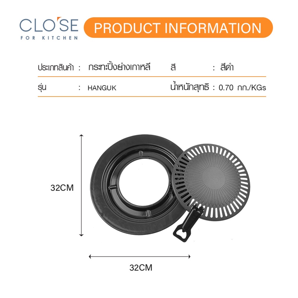 GlobalHouse CLOSE กระทะปิ้งย่างเกาหลี 32x32x4ซม. สีดำ HANGUK สินค้าของแท้คุณภาพดี