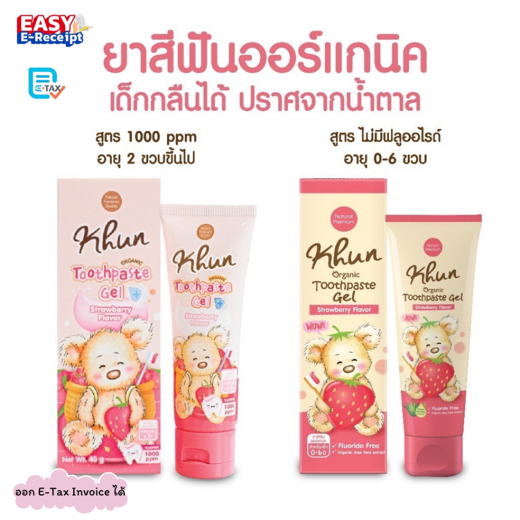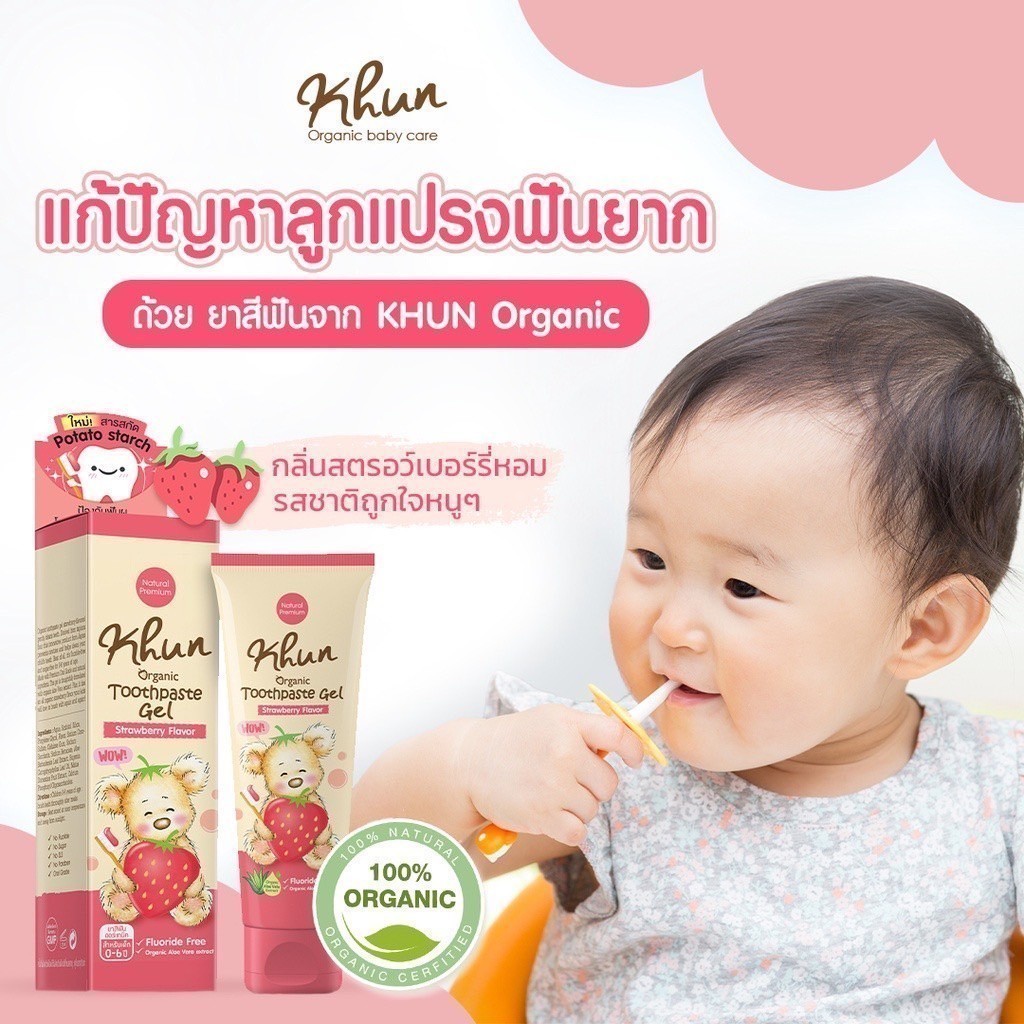 Khun ยาสีฟัน ออแกนิค สำหรับเด็กแรกเกิด-6ปี กลืนได้ ไม่มีน้ำตาล ไม่มีฟลูออไรด์ รสสตรอเบอรี่หอมๆ food grade 100%