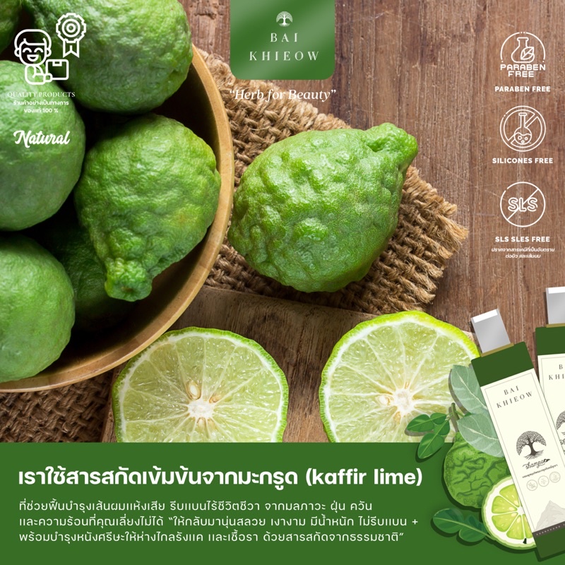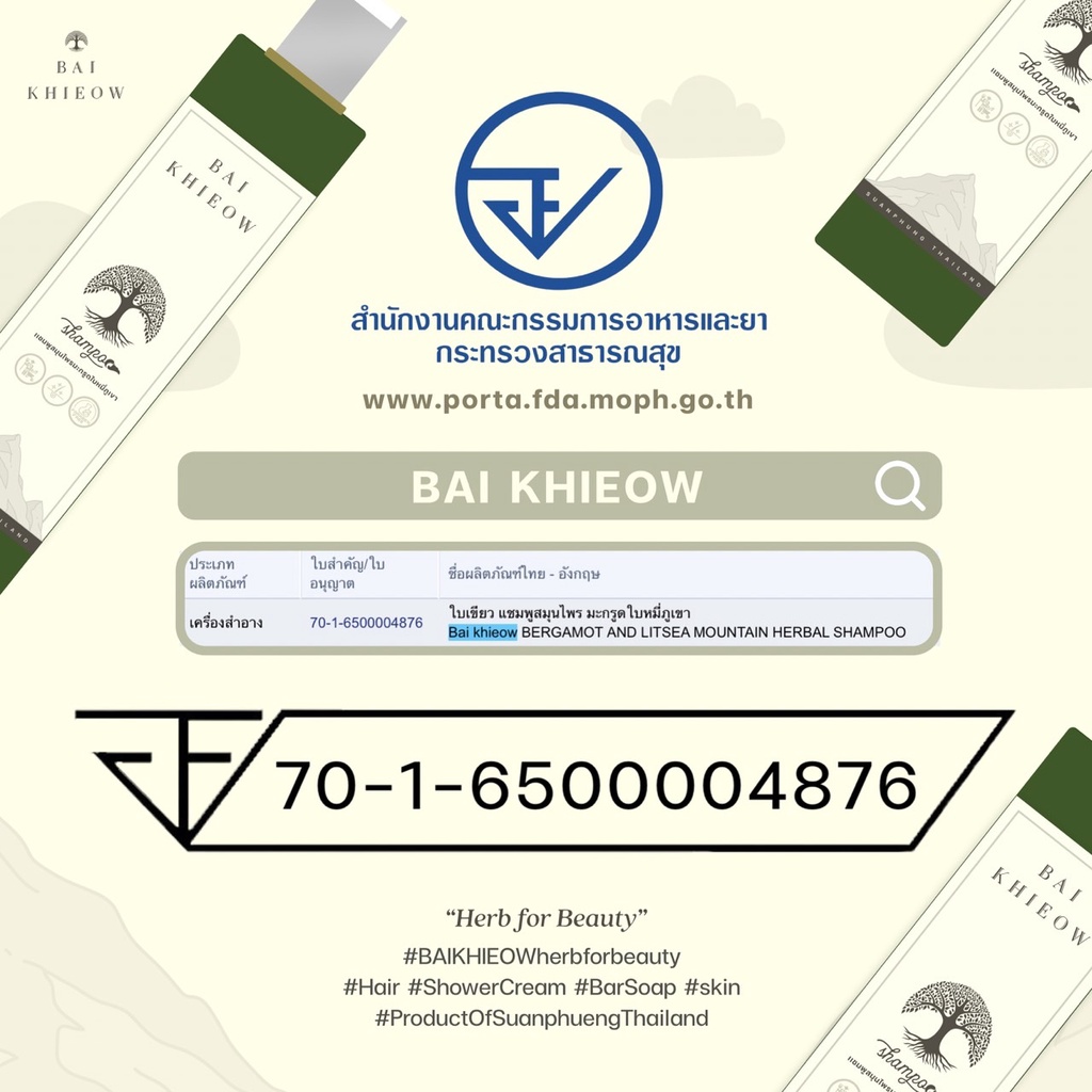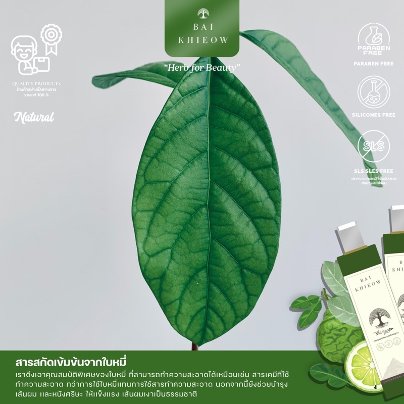 BAI KHIEOW | เเชมพูสมุนไพรมะกรูดใบหมี่ภูเขา ( 250 ML. X1 ขวด ) สำหรับผมร่วง ผมบาง อ่อนโยน ไม่แห้งแข็ง