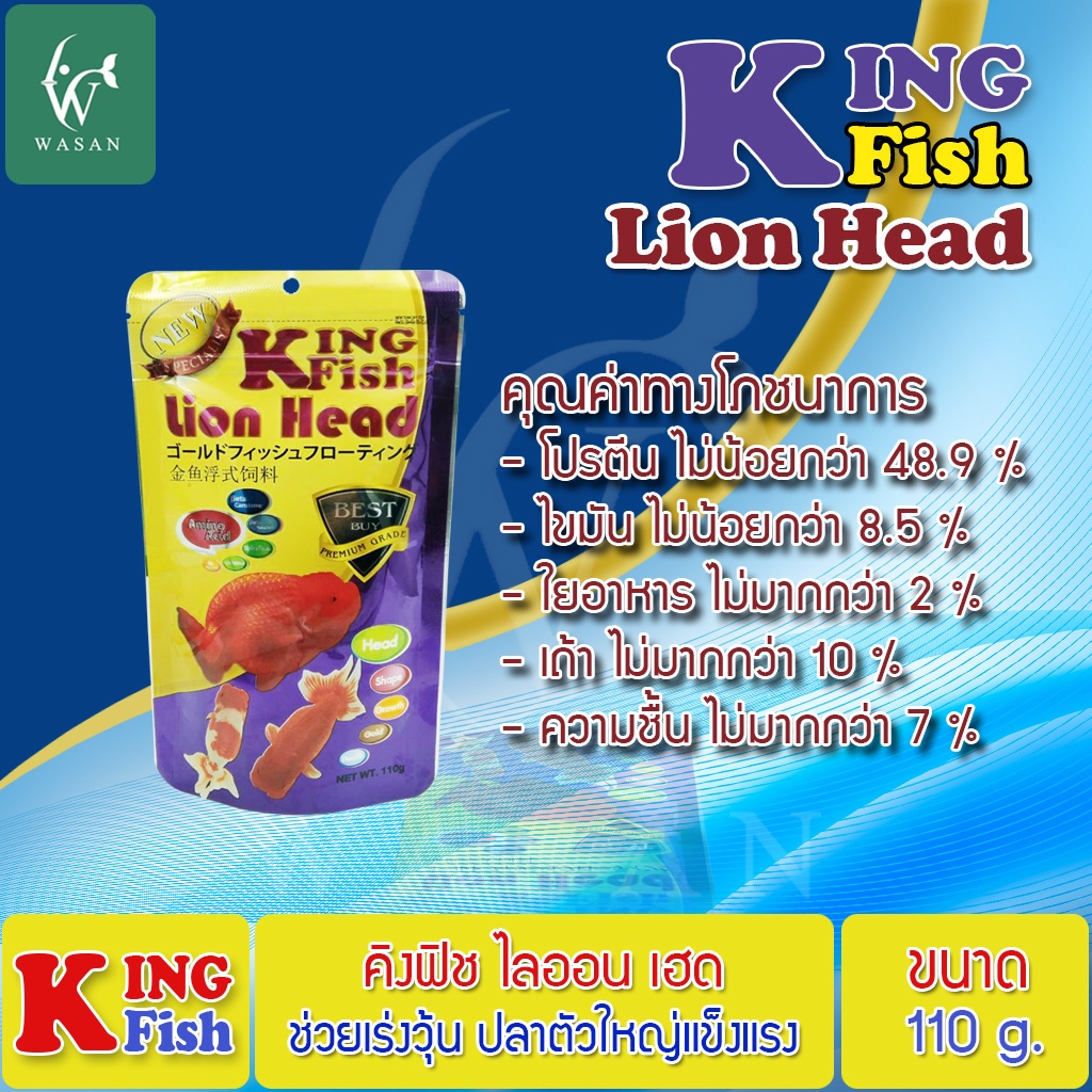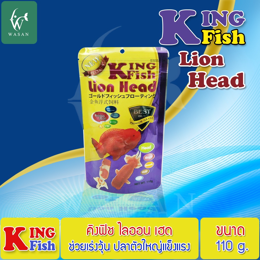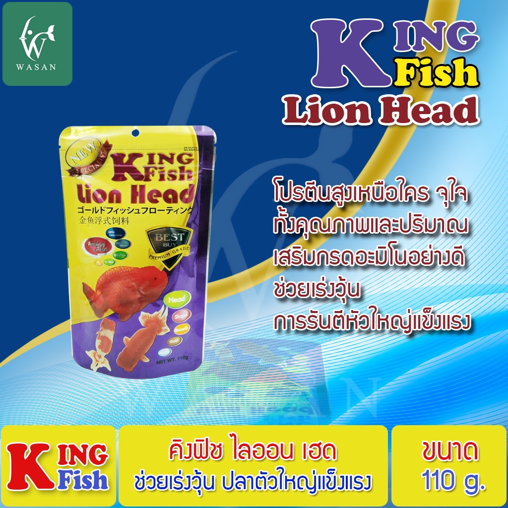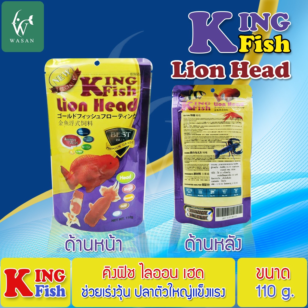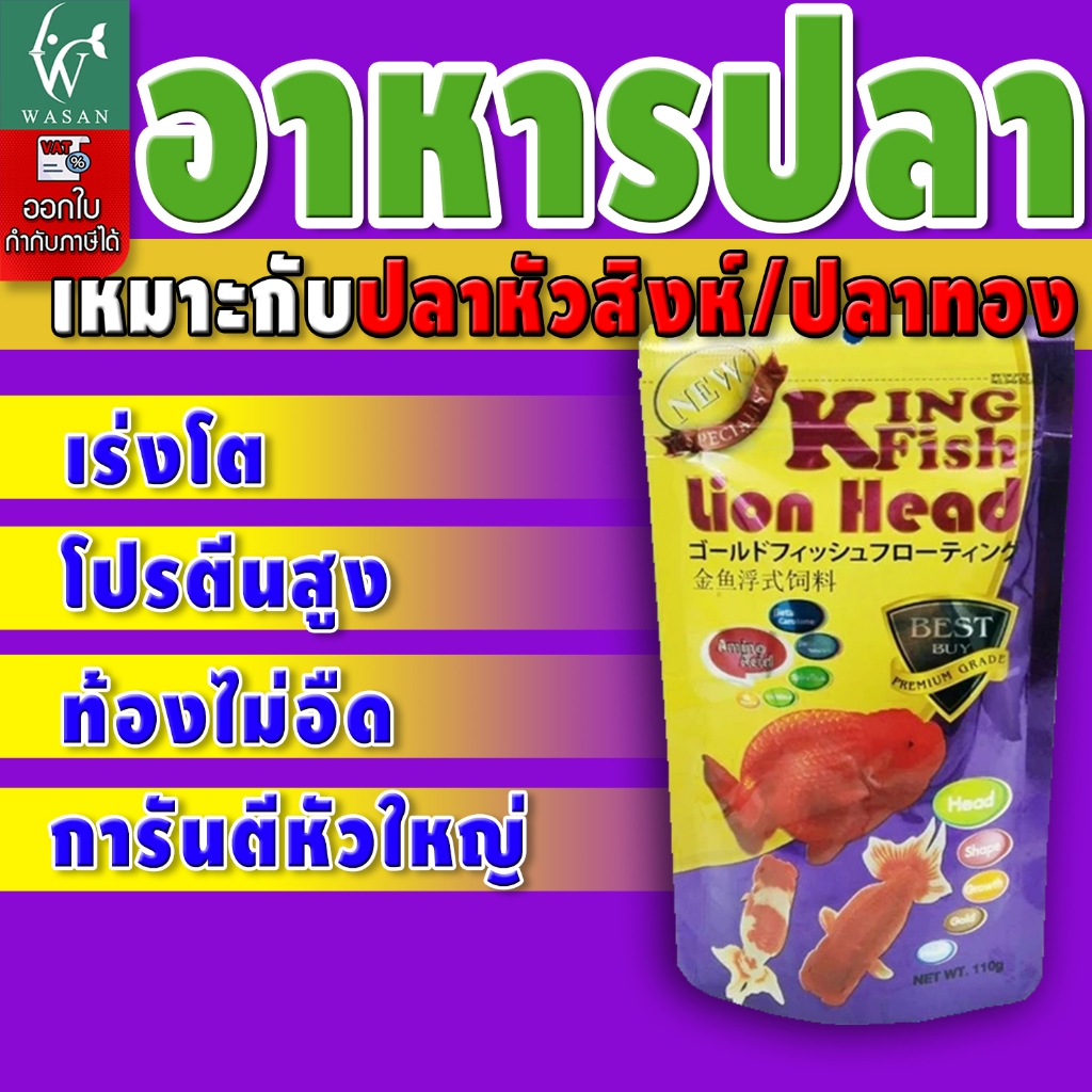 อาหารปลา คิงฟิช king fish Lion Head 110 กรัม./330 กรัม สำหรับปลาหัวสิงห์และปลาทอง (แบบเม็ดจม) โปรตีนสูง