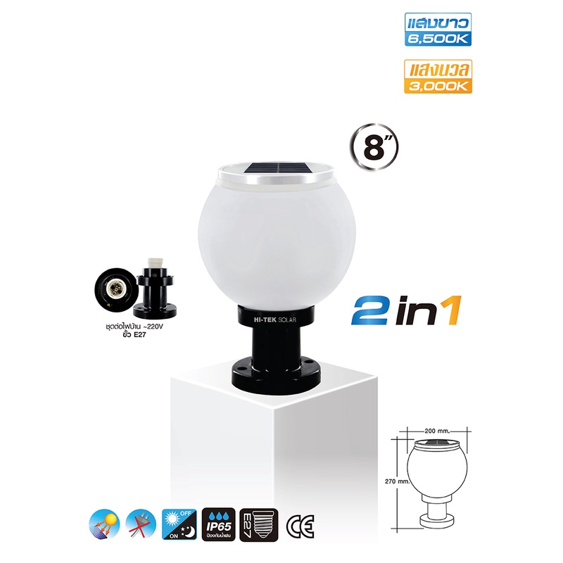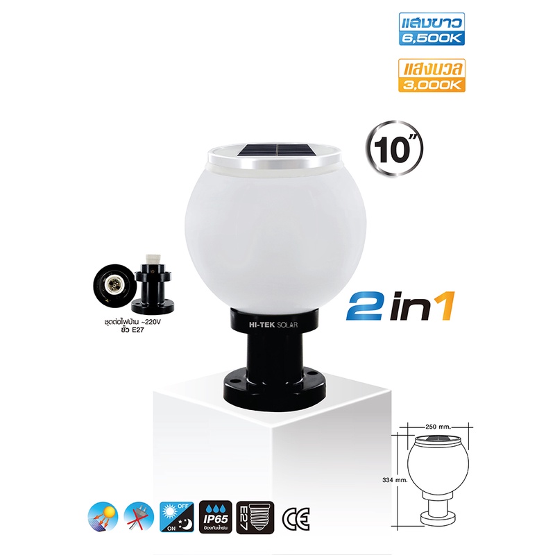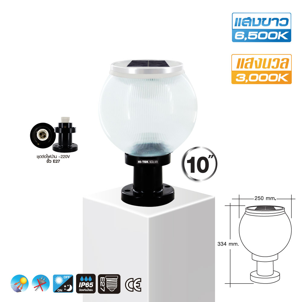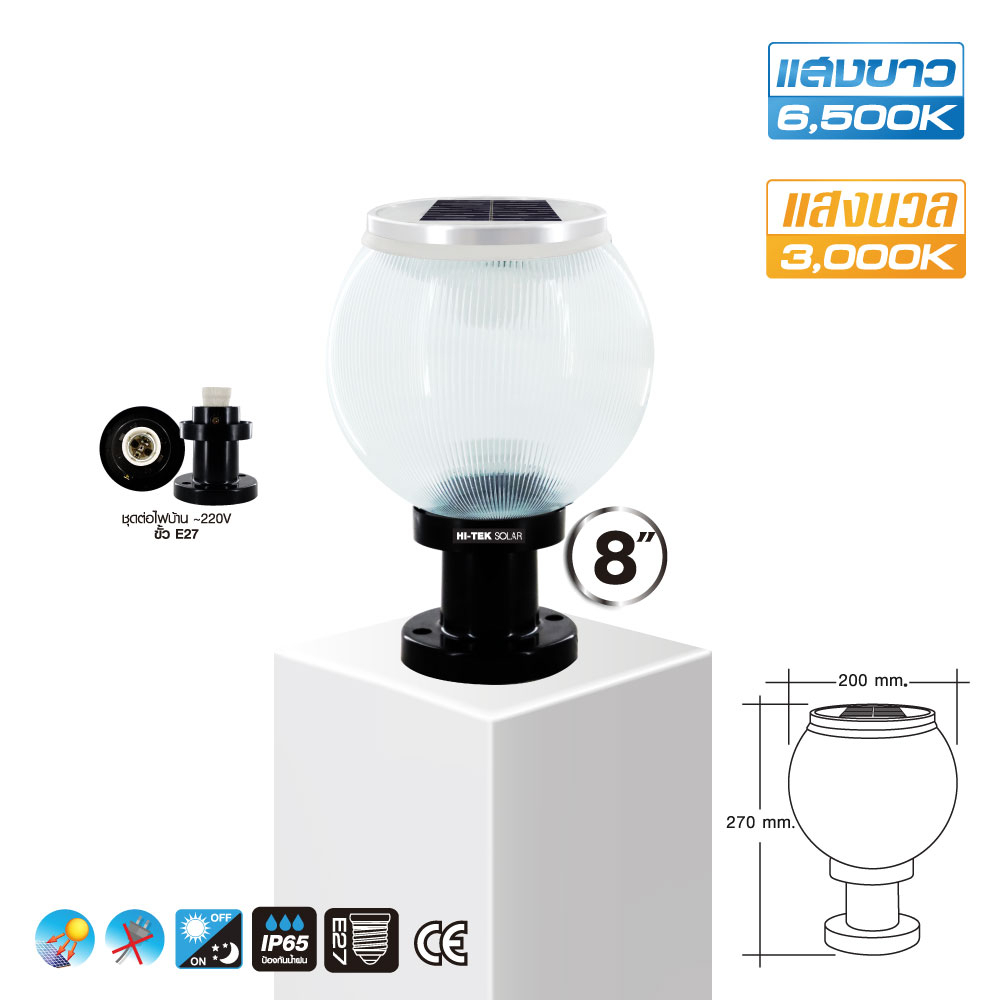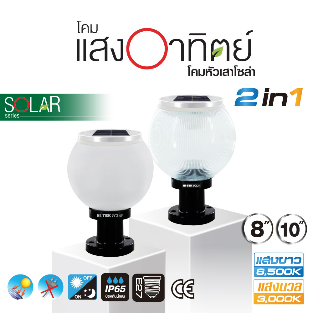 HI-TEK โคมไฟหัวเสาโซล่าเซล LED ขนาด 8นิ้ว และ 10 นิ้ว