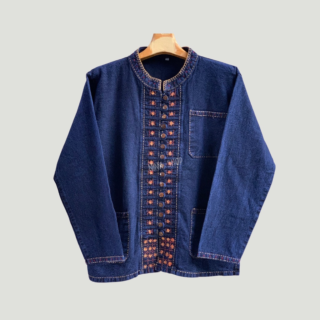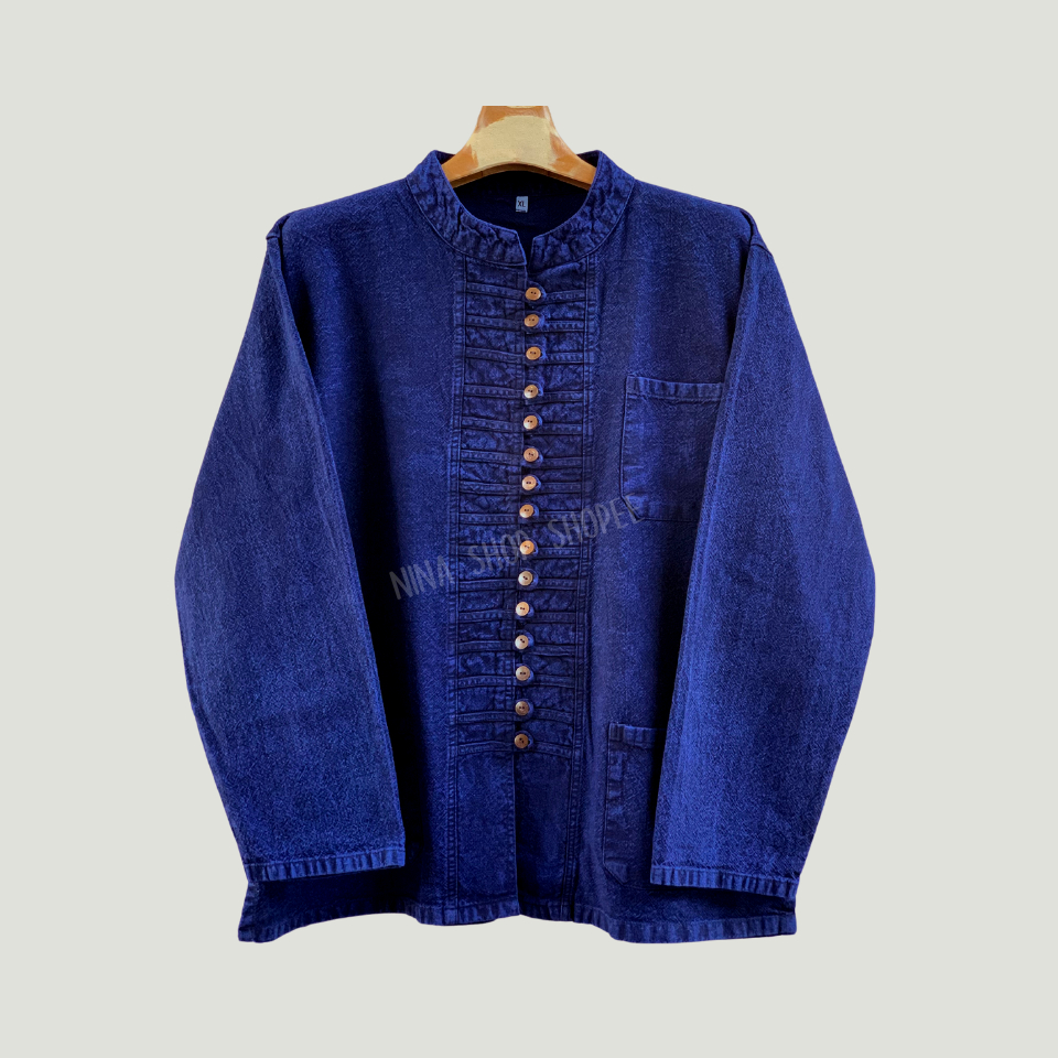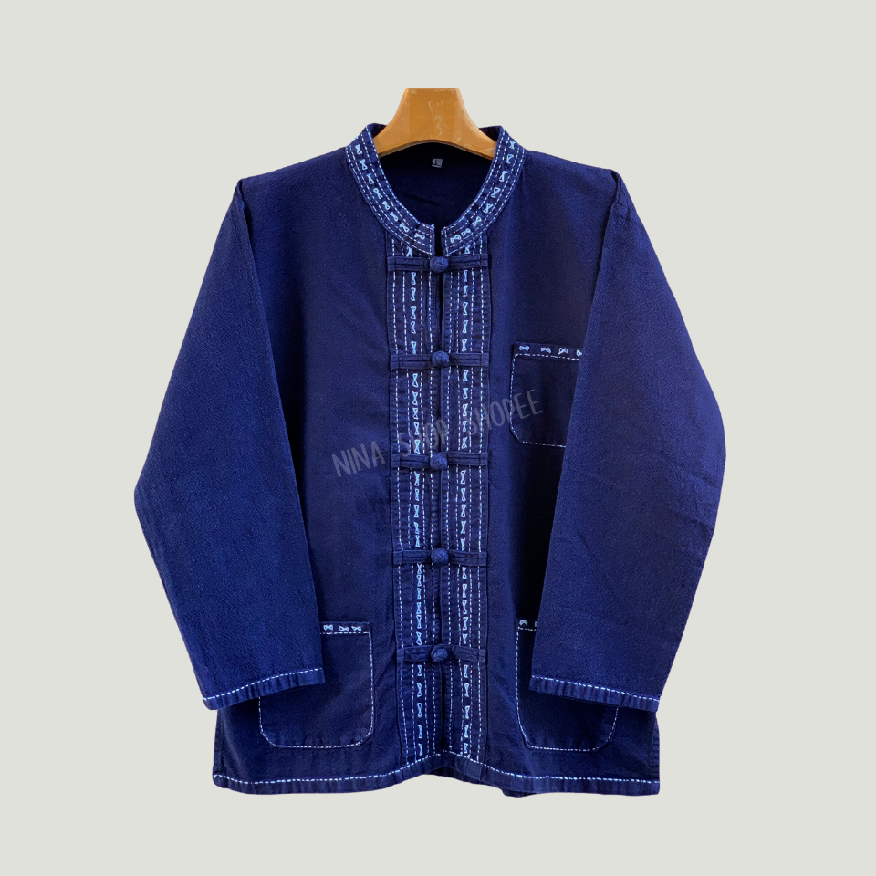 เสื้อผ้าฝ้ายม่อฮ่อมฟอกสโตนแท้ 100%คอจีนผู้ชาย ทรงตรงสวมใส่สบาย พร้อมงานปักแฮนด์เมดสไตล์ล้านนา สวมใส่สบายเนื้อผ้านุ่มสุดๆ