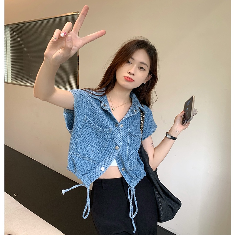 เสื้อแจ็กเก็ตยีนสั้น คอปก ทรงหลวม สไตล์เกาหลี แฟชั่นฤดูร้อน สําหรับผู้หญิง