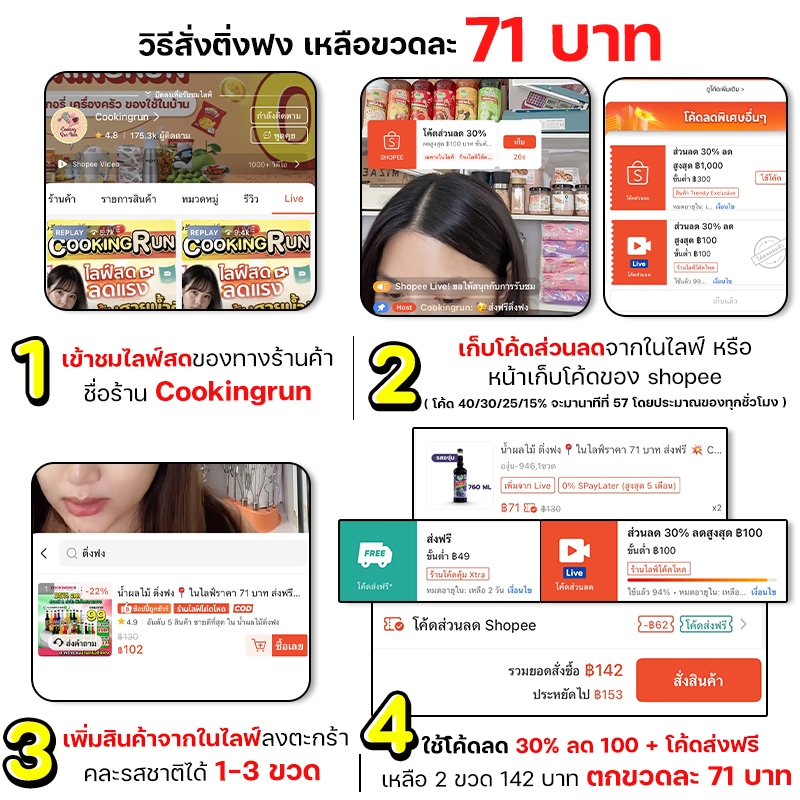 น้ำผลไม้ ติ่งฟง📍ในไลฟ์ราคา 71 บาท ส่งฟรี 💥 Cookingrun น้ำหวานติ่งฟง 📌