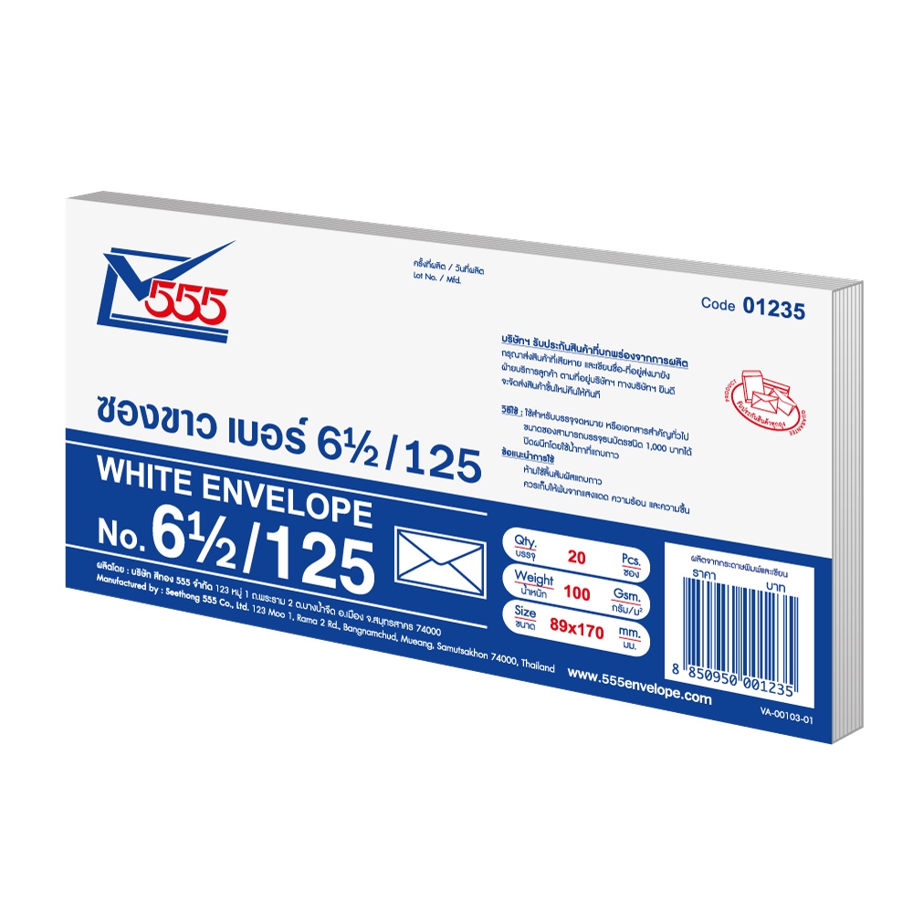 ซองขาว เบอร์ 6 1/2 /125 ฝาสามเหลี่ยม ซองขาว (แพ็ค20ซอง) ซองขาว 555