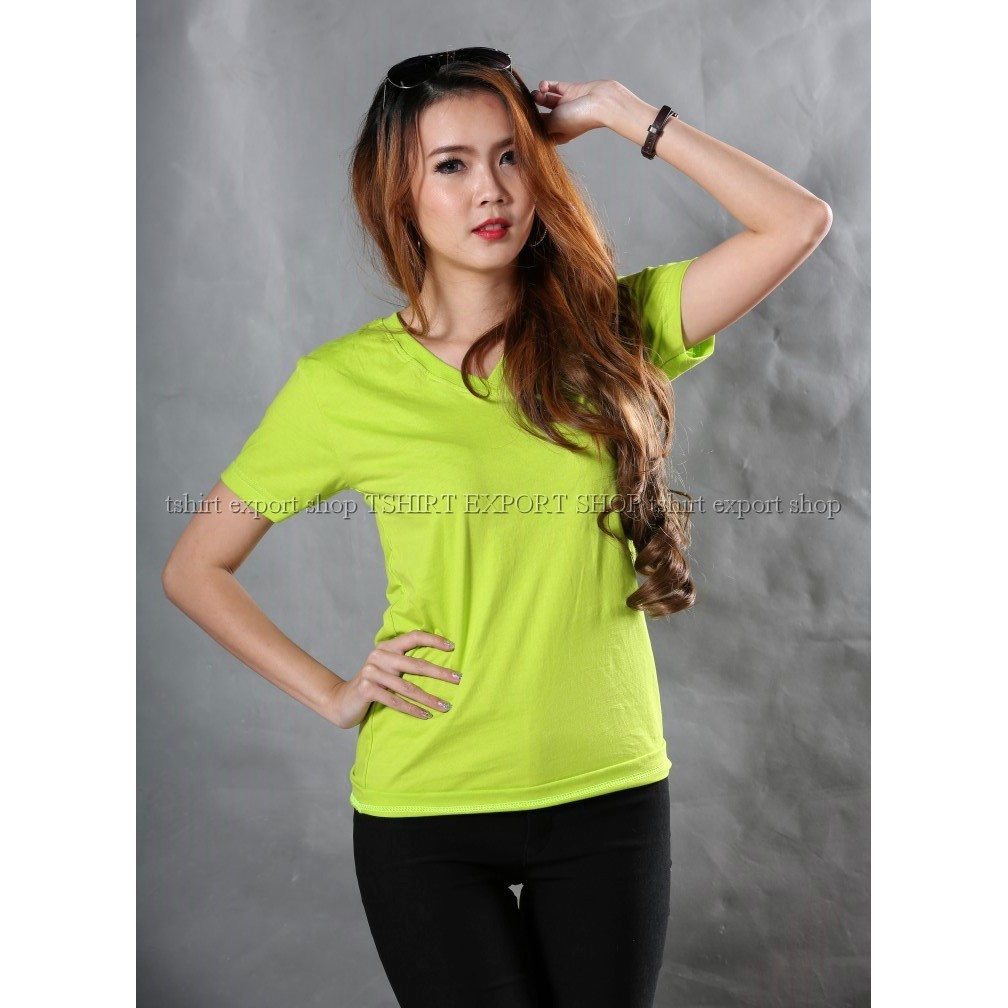 เสื้อยืด แฟชั่น ผู้หญิง ทรงตรง T-Shirt Cotton 100% คอวี แขนสั้น สีเขียวมะนาว