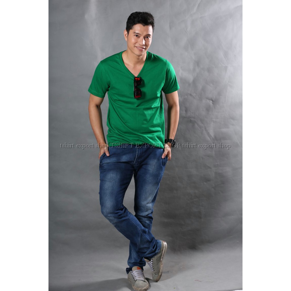 เสื้อยืด แฟชั่น ผู้ชาย ทรงตรง T-Shirt Cotton 100% คอวี แขนสั้น สีเขียว