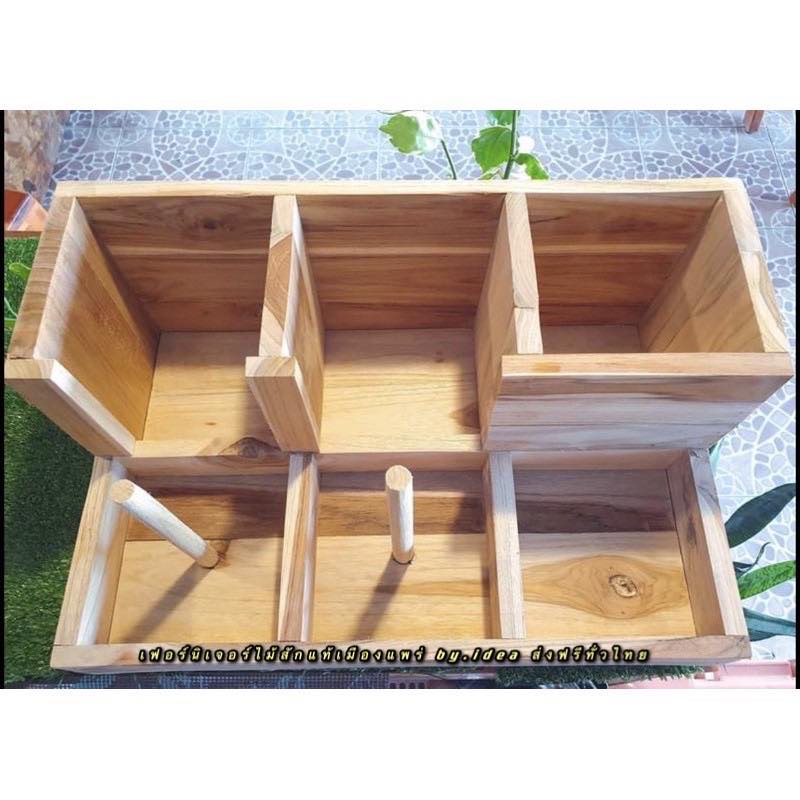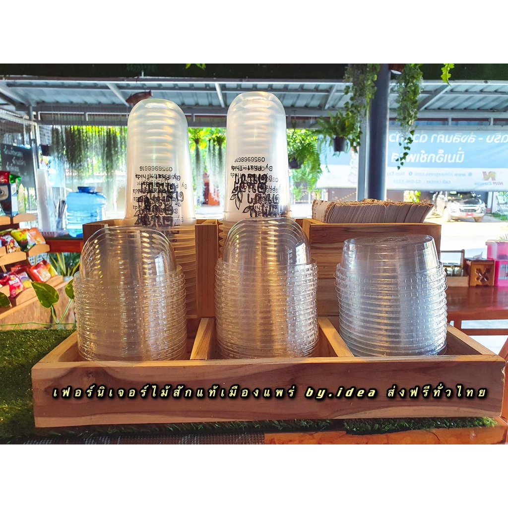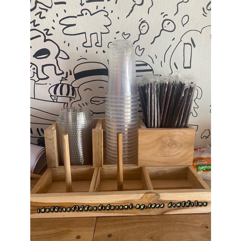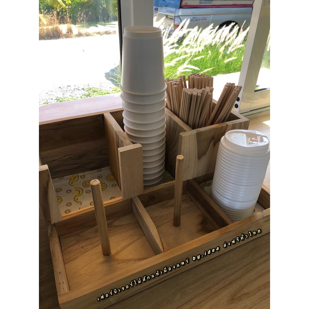 กล่องใส่แก้วกาแฟ 6 ช่องใหญ่ คว่ำแก้วกาแฟ 16-32 OZ. ใส่หลอดดูด เก็บฝาได้ งานไม้สัก