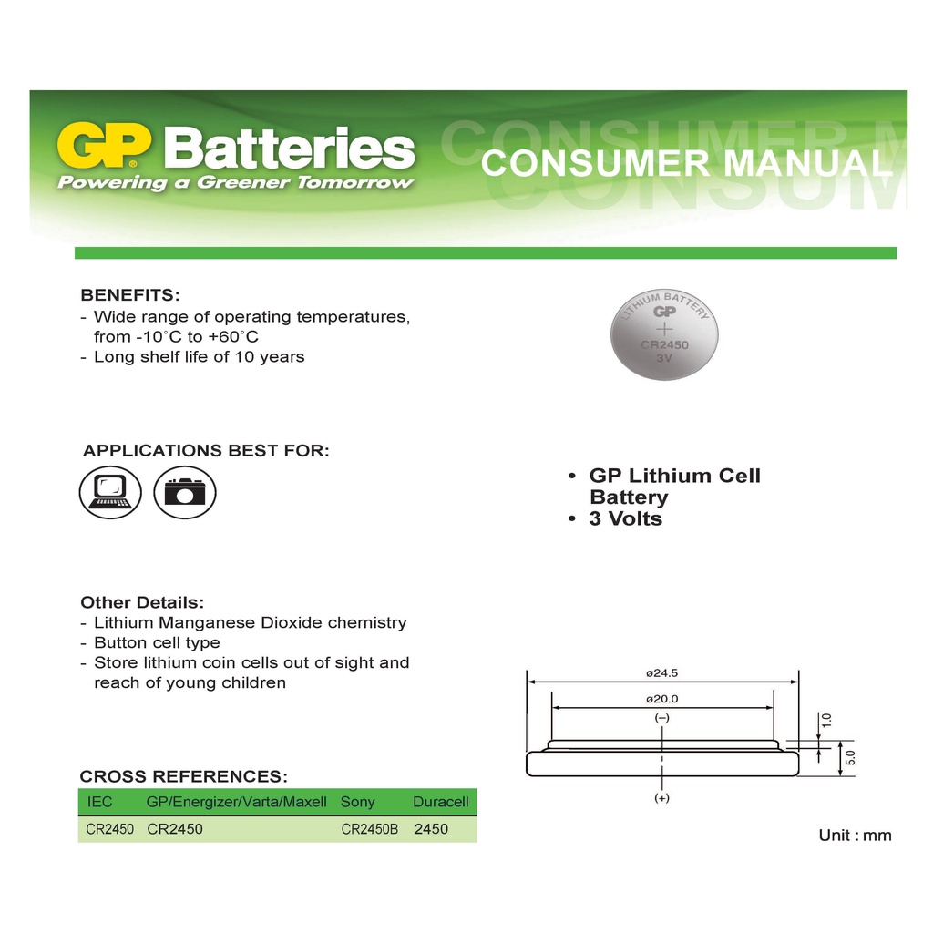 GP BATTERY LITHIUM CELL รุ่น CR2450 3V ถ่านกระดุม (DL2450) (CR2450-2C5) 1แผง 5ก้อน