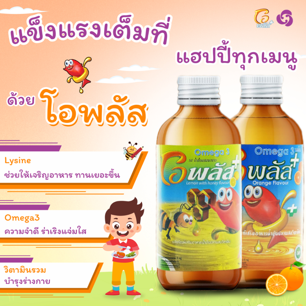 O-Plus โอพลัส โอเมก้า 3 น้ำมันปลา รสส้ม วิตามินรวม สำหรับเด็กบำรุงสมอง เจริญอาหาร ขวด120 มล. (1 ขวด)(แถมฟรีฟริสซี 1 ซอง)