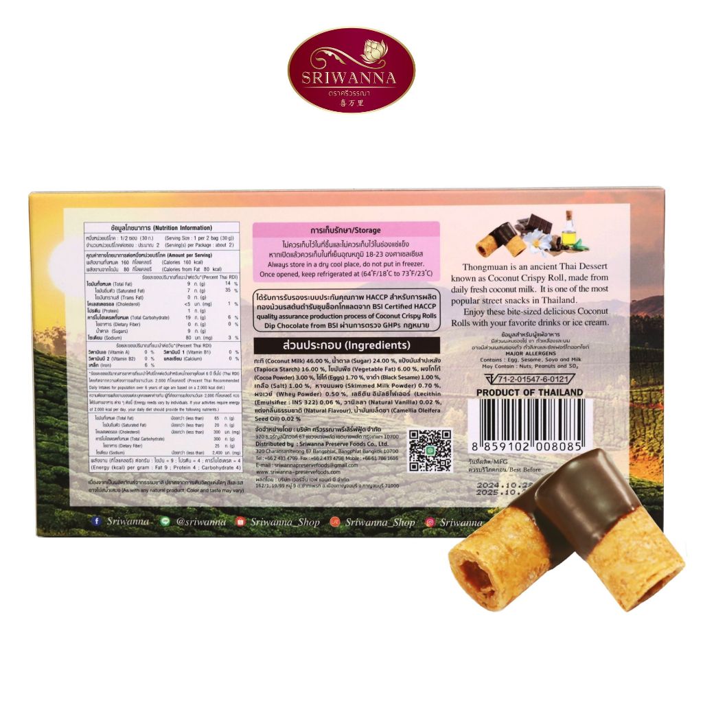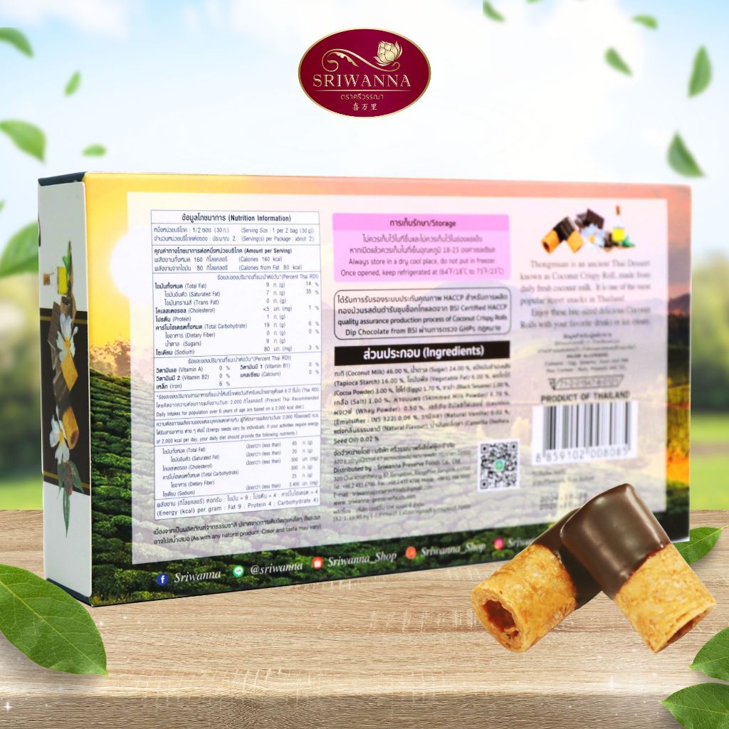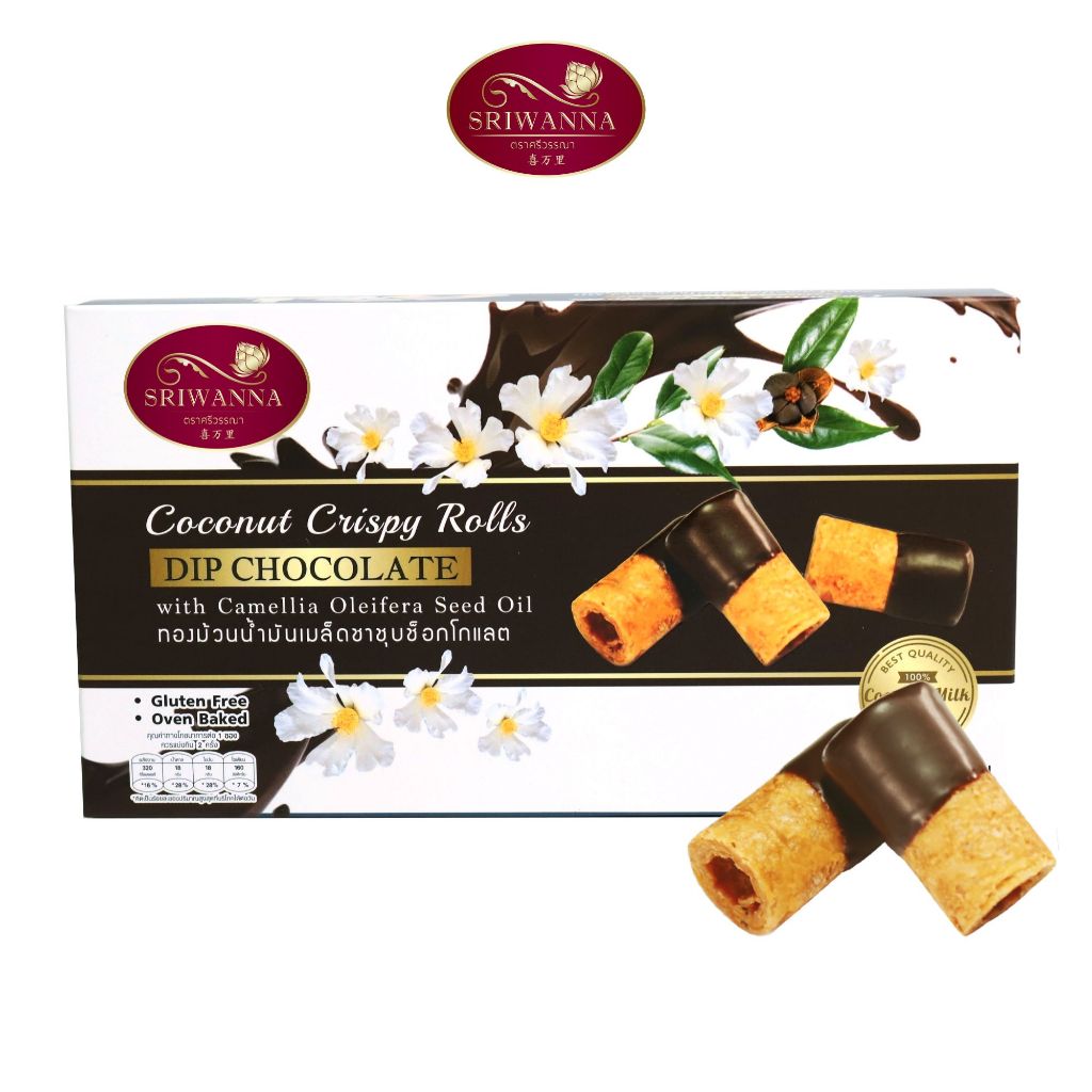 ศรีวรรณา ทองม้วนต้นตำรับผสมน้ำมันเมล็ดชาชุบช็อกโกแลต 60 กรัม