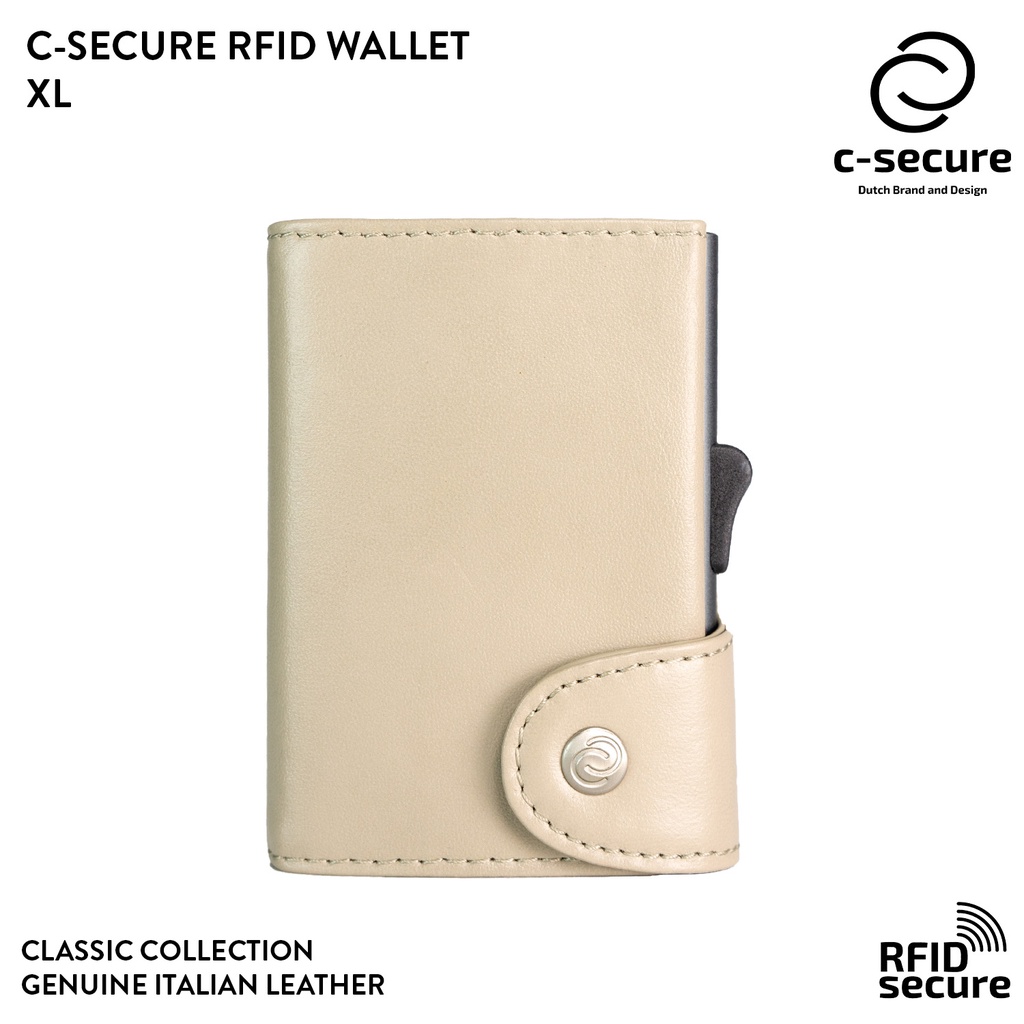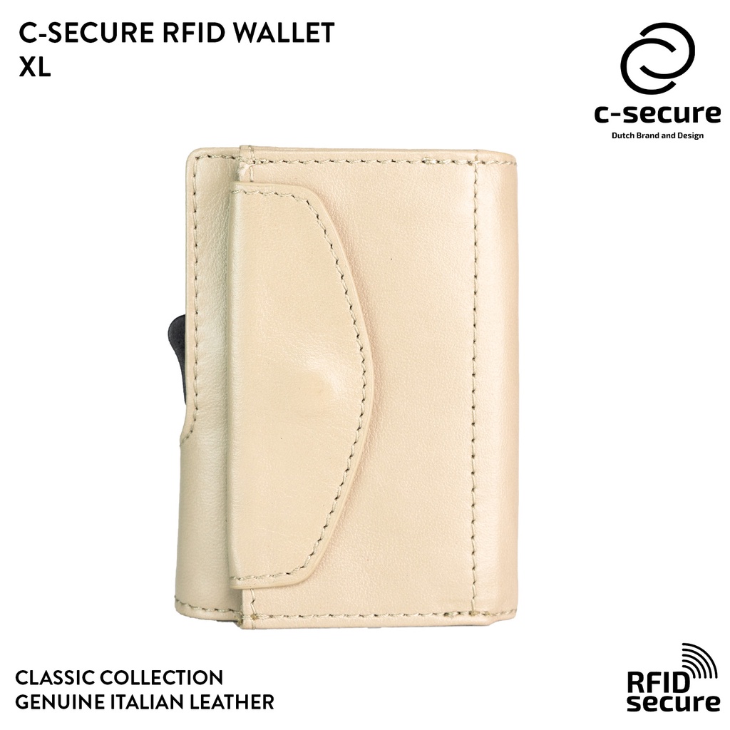 C-SECURE กระเป๋าใส่บัตร กระเป๋าสตางค์ กระเป๋าใส่การ์ด RFID รุ่นหนังแท้ ขนาด XL มีช่องใส่เหรียญ สีครีมเบจ