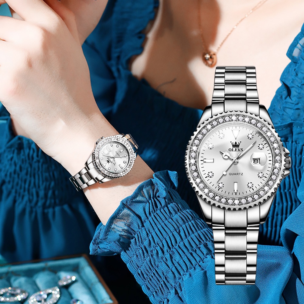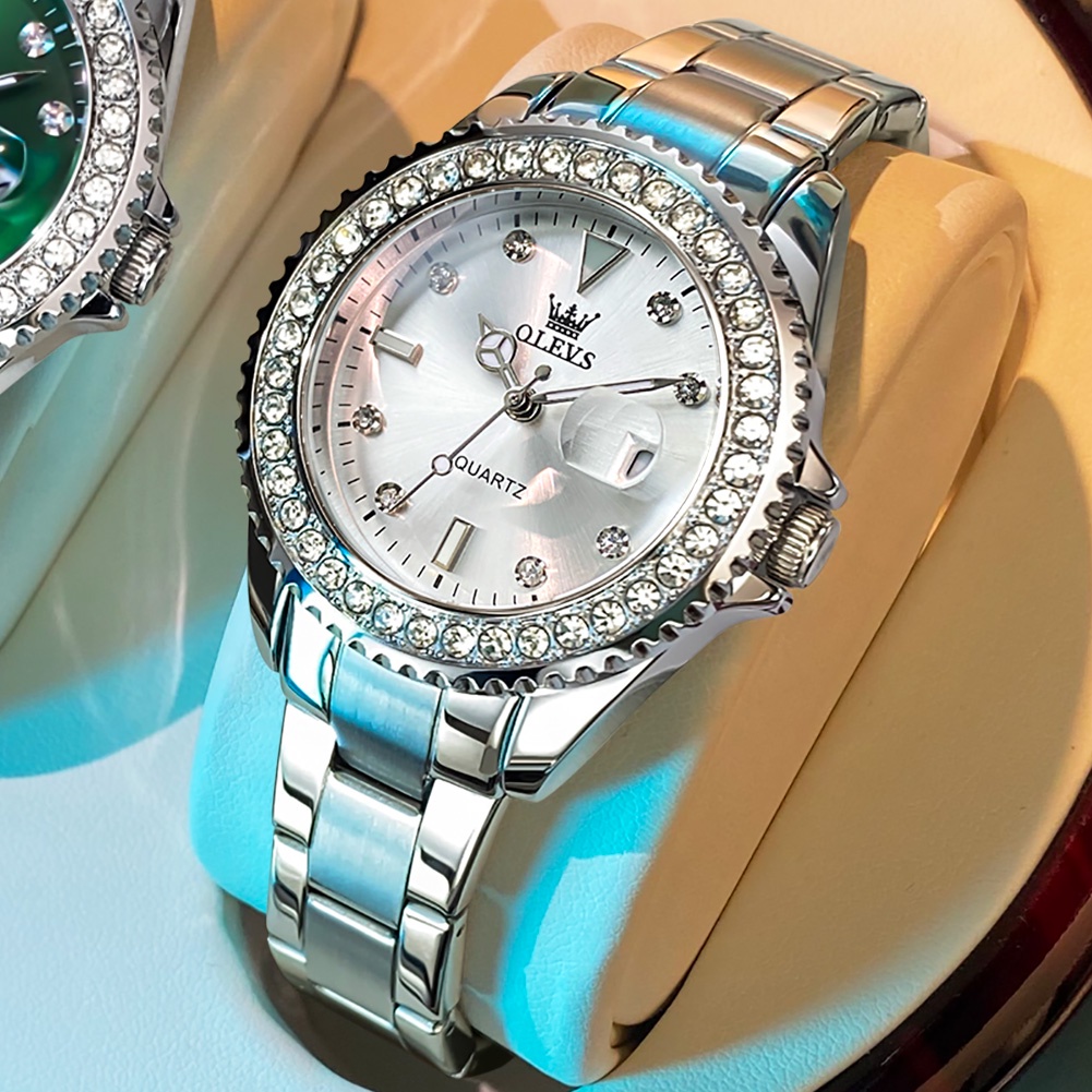 OLEVS นาฬิกาข้อมือผู้หญิง แฟชั่น เหล็กกล้าไร้สนิม นาฬิกาข้อมือกันน้ำ สีขาว สีเขียว 9945