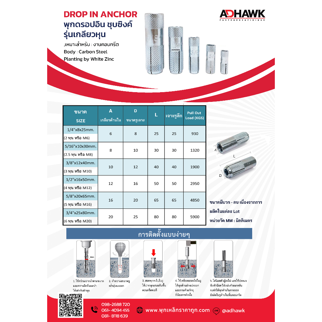 พุกดรอปอิน,พุกตอก,พุกระเบิด ชุบซิงค์ เกลียวหุน (กล่อง100ตัว) ขนาด 1/4" ยกกล่องราคาพิเศษ
