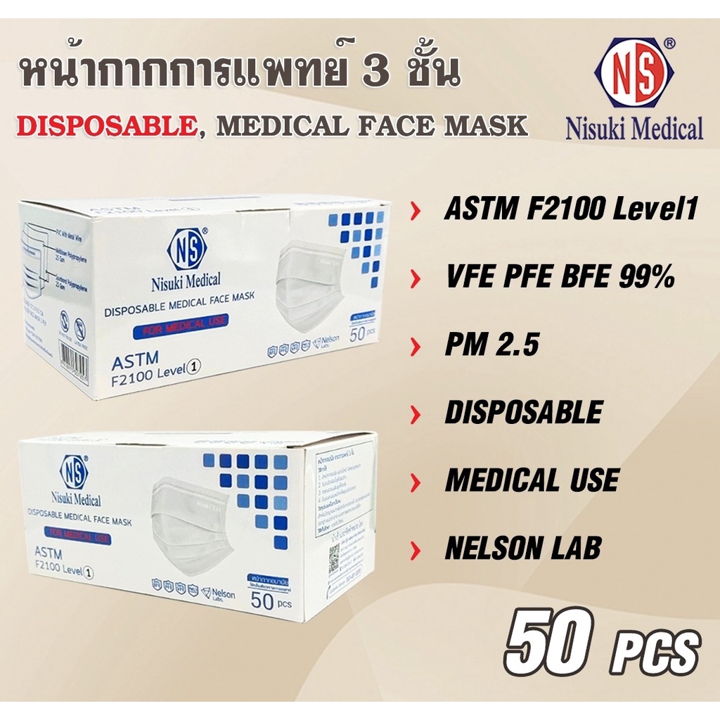 หน้ากากการแพทย์ 3 ชั้น สำหรับผู้ใหญ่ สีขาว มี อย , นำเข้าจีน , BFE PPE VFE ,Nelson , F2100 Level 1