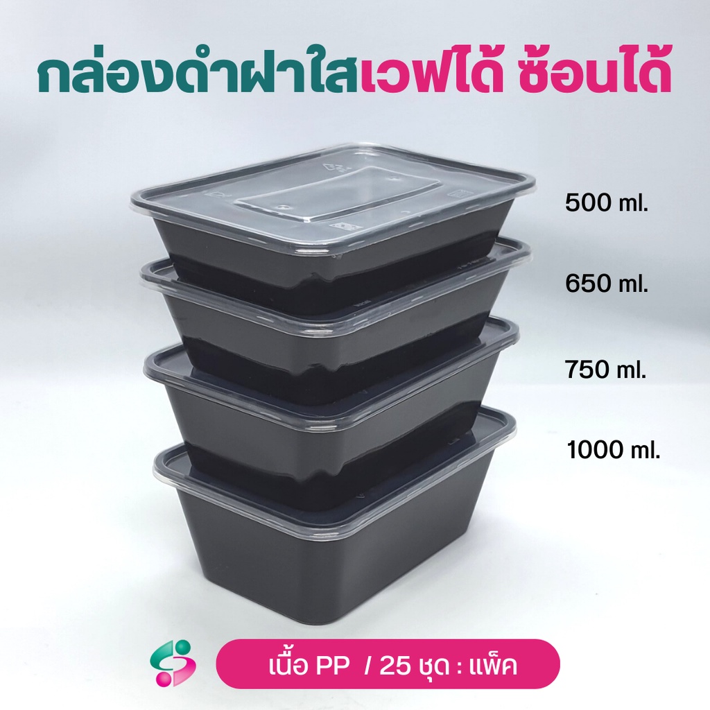 NLกล่องข้าว 1 ช่อง กล่องพลาสติกPP กล่องใส่อาหาร จุ 500/ 650 /750 /1000 ml สีดำ ฝาใส