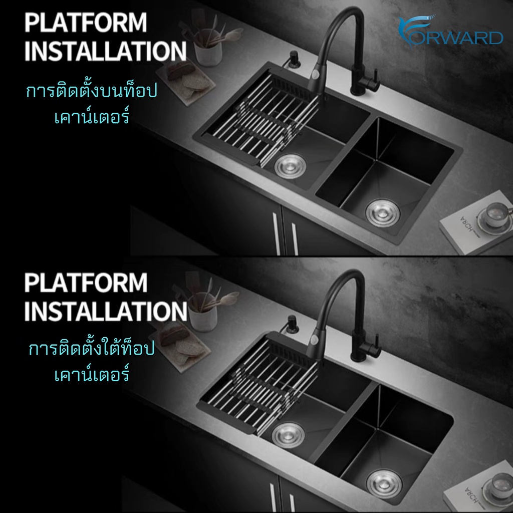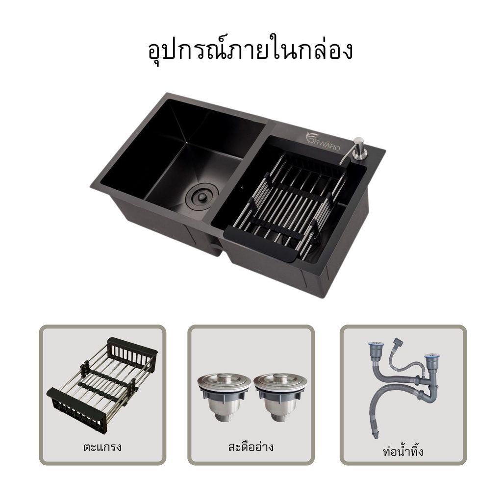 Forward ซิงค์ล้างจาน อ่างล้างจาน 2หลุม วัสดุสแตนเลส เคลือบนาโนสีดำ ขนาด80x45ซม. black sink handmade รุ่น HM8045