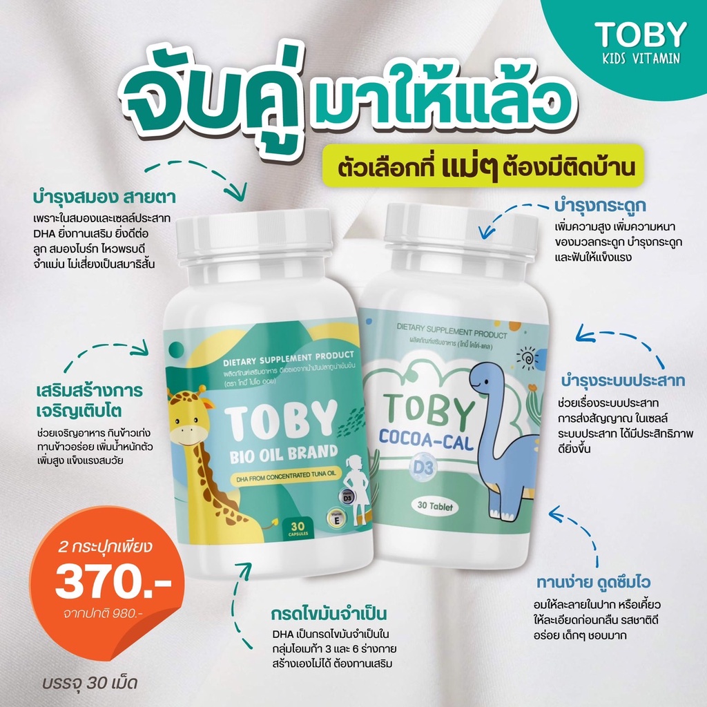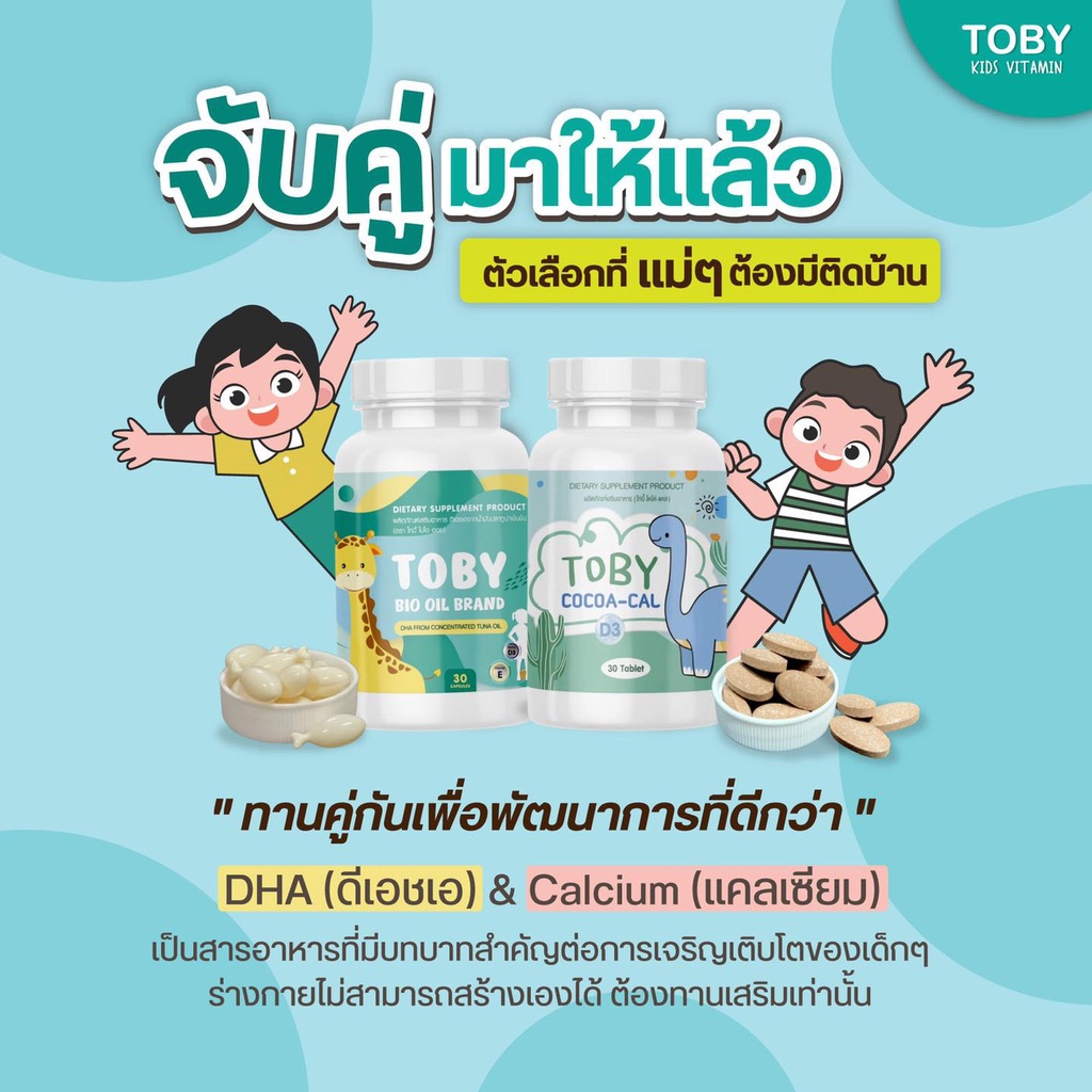 Toby bio oil & Cocoa cal โทบี้ไบโอออยล์ / โคโค่แคล แผลิตภัณฑ์อาหารเสริมสำหรับเด็ก บำรุงสมอง บำรุงกระดูก 30 แคปซูล