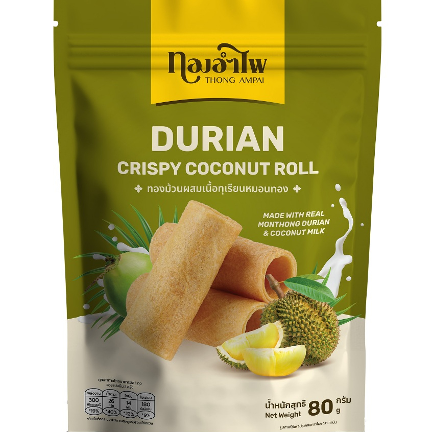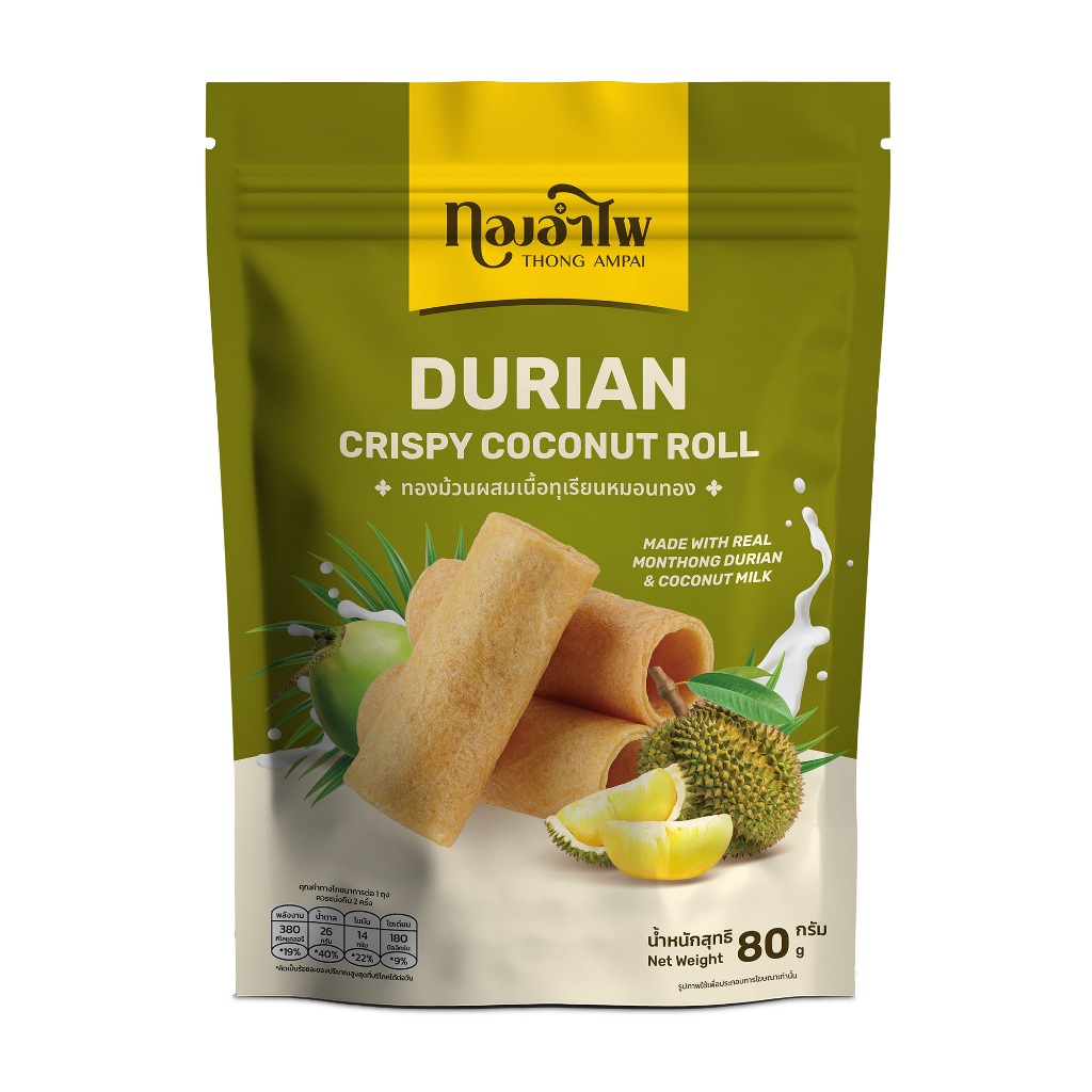 ทองอำไพ ทองม้วนผสมเนื้อทุเรียน 80 กรัม THONG AMPAI COCONUT CRISPY ROLL WITH DURIAN 80G