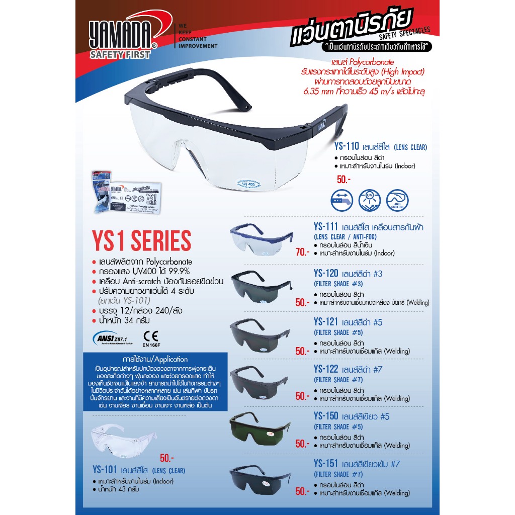แว่นตานิรภัย YS-Series YAMADA แว่นตาป้องกันสะเก็ด แข็งแรง ทนทาน ได้มาตรฐาน น้ำหนักเบา ใส่สบาย