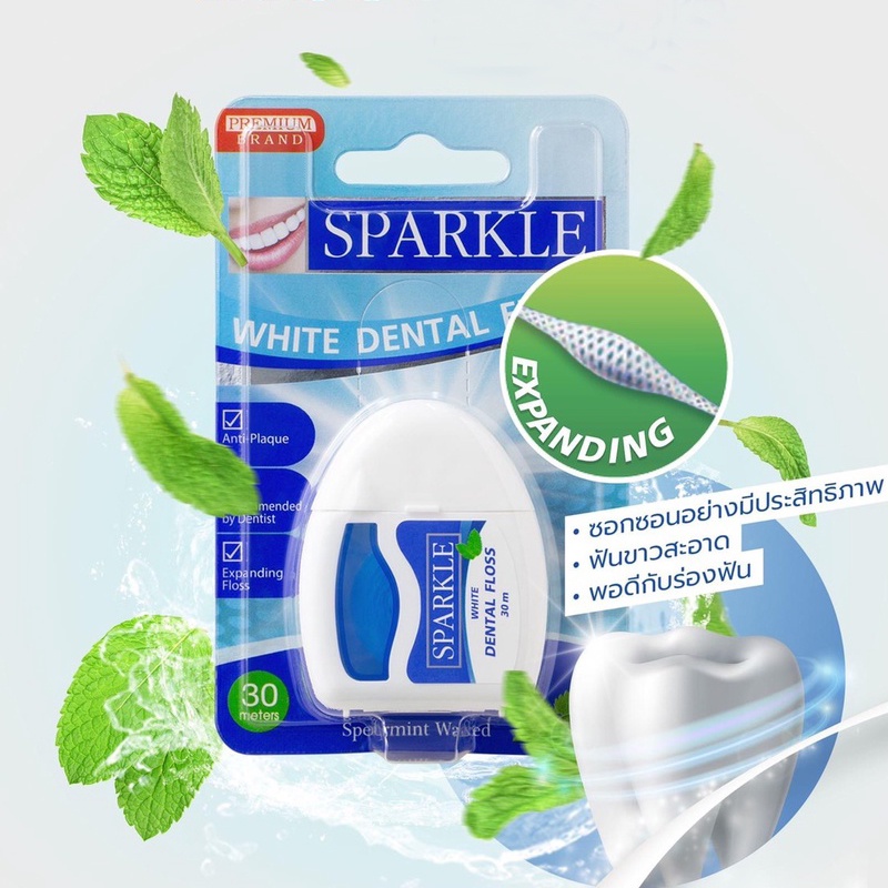 New ปี24 Sparkle White Dental ไหมขัดฟัน สปาร์คเคิล เพื่อฟันขาว กลิ่นสเปียร์ มิ้นท์ ขนาด 30 เมตร ผลิตปี24