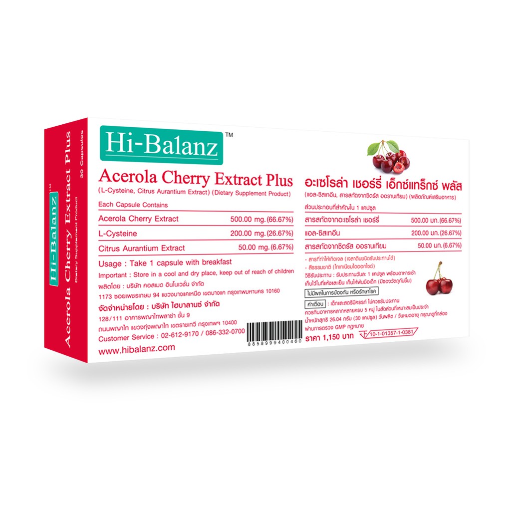 [ผลิตภัณฑ์ดูแลผิว] Hi-Balanz Acelora Cherry Extract Plus อะเซโรล่า เชอร์รี่ 1 กล่อง 30 แคปซูล