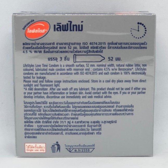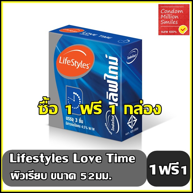LifeStyles LoveTime Condom ++ซื้อ 1 ฟรี 1 กล่อง++ ถุงยางอนามัยไลฟ์สไตล์ เลิฟไทม์ ผิวเรียบ ลดความไว ขนาด 52 มม.