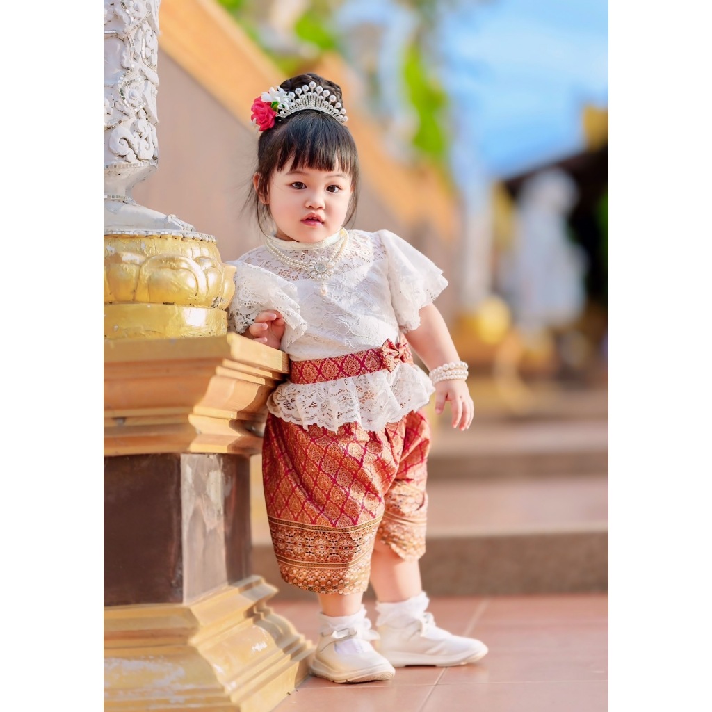 ชุดไทยแม่ลูก เสื้อลูกไม้ กางเกงโจงกระเบน ชุดไทยไปโรงเรียน ชุดไทยครอบครัว Mae-Mali Jongkraben