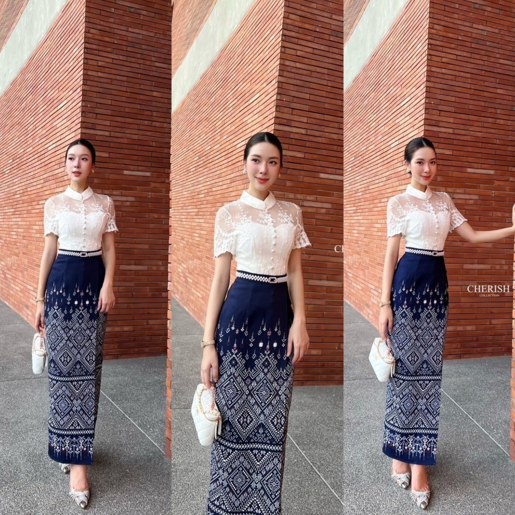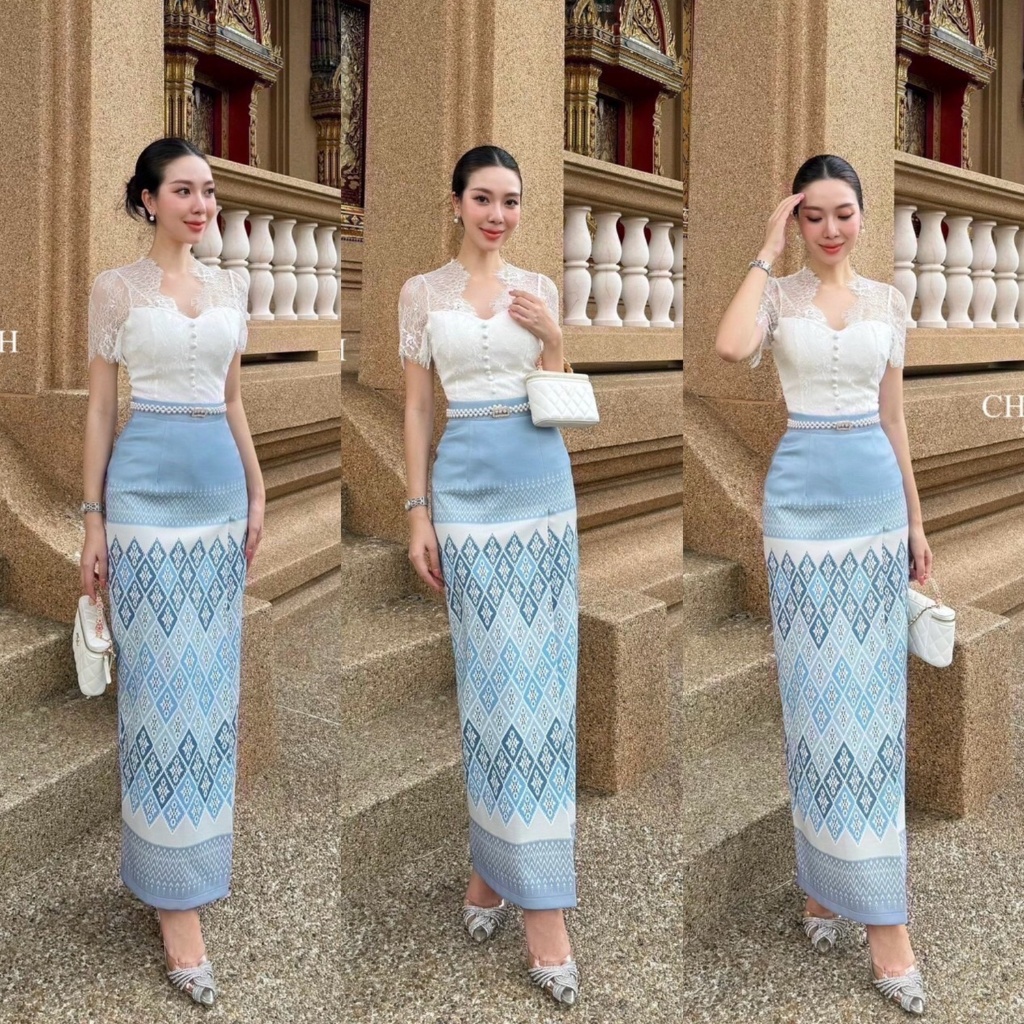 ❣️พร้อมส่ง📌 ชุดไทย เสื้อลูกไม้+กระโปรงสำเร็จพิมพ์ลาย ใส่ออกงาน งานบุญ งานบวช แฟนนาค PS.CLOSET