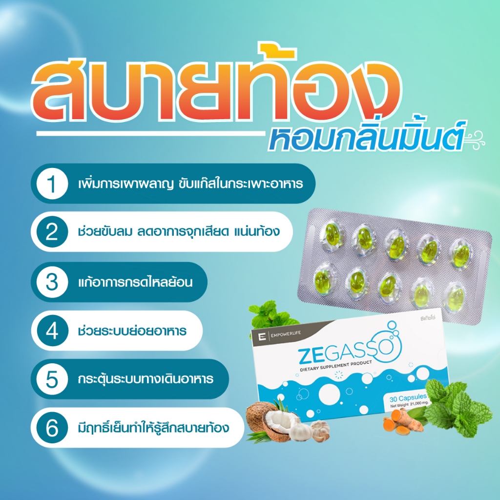 Ze-Gasso สมุนไพรขับลม ลดแน่น–อืด จุกเสียด | ช่วยย่อย หลังอาหาร | 3 แผง (30 แคปซูล)