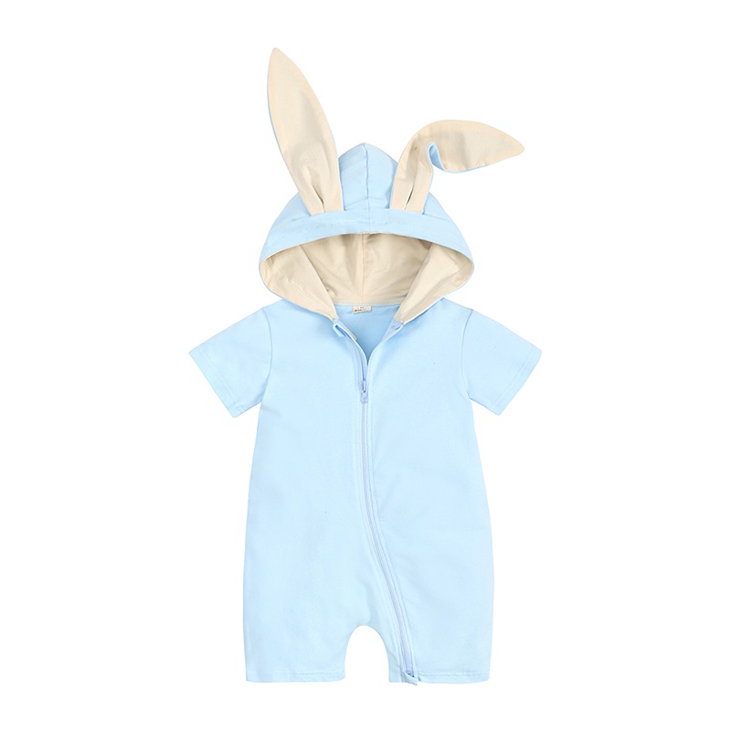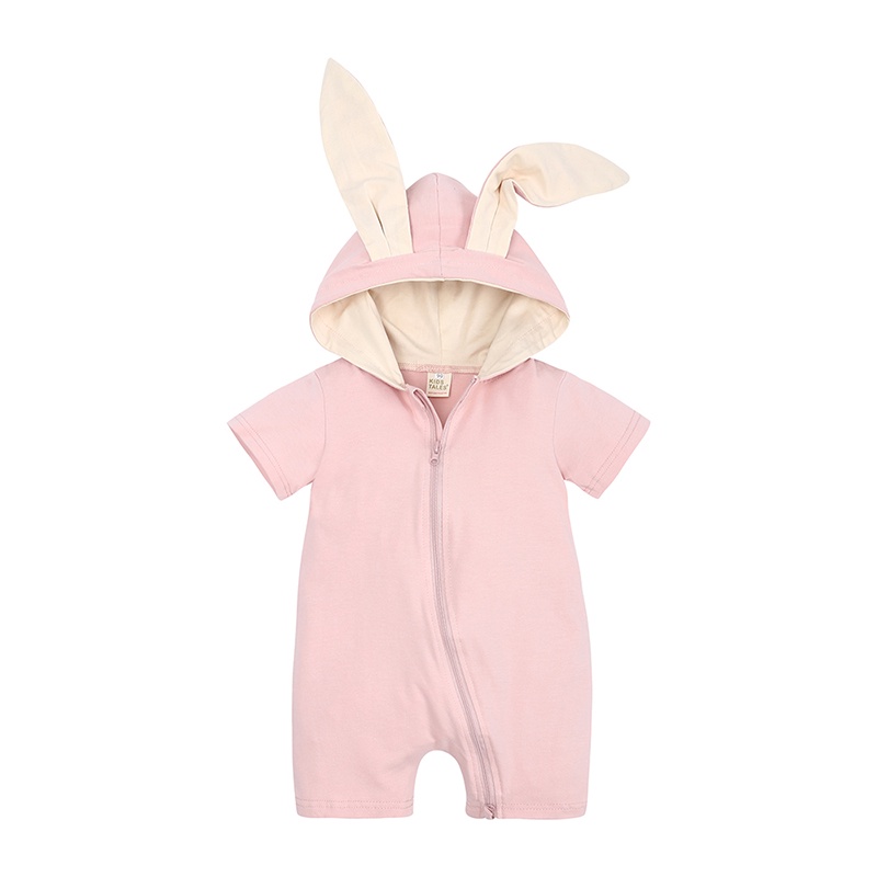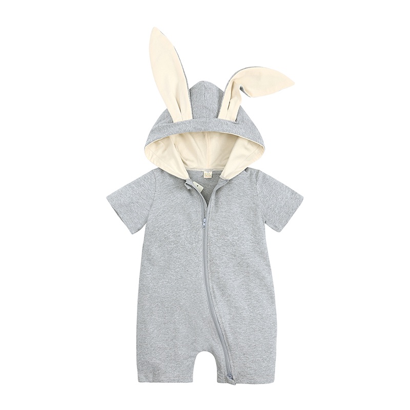 ชุดจั๊มสูทรอมเปอร์ แขนสั้น มีฮู้ด ผ้าฝ้าย แต่งซิป ลายหูกระต่ายน่ารัก แฟชั่นฤดูร้อน สําหรับเด็กทารกแรกเกิด ผู้ชาย และเด็กผู้หญิง อายุ 0-18 เดือน