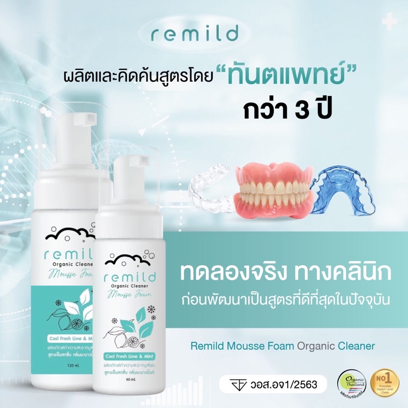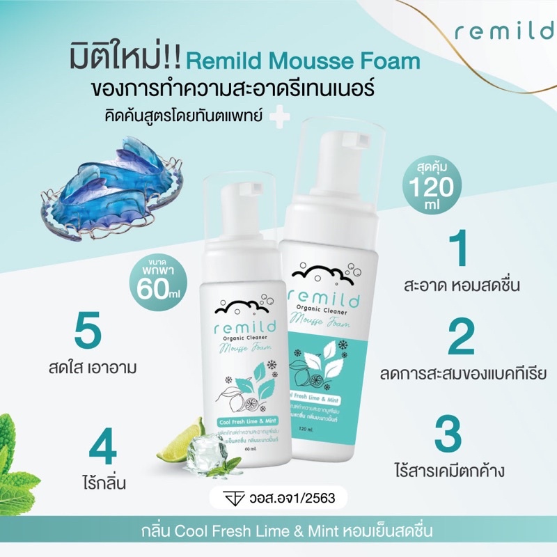 Remild มูสโฟม สำหรับทำความสะอาดรีเทนเนอร์ จัดฟันใส ฟันปลอม แพคเกจใหม่ ขนาด 60 และ 120 ml กลิ่น Cool fresh lime&mint