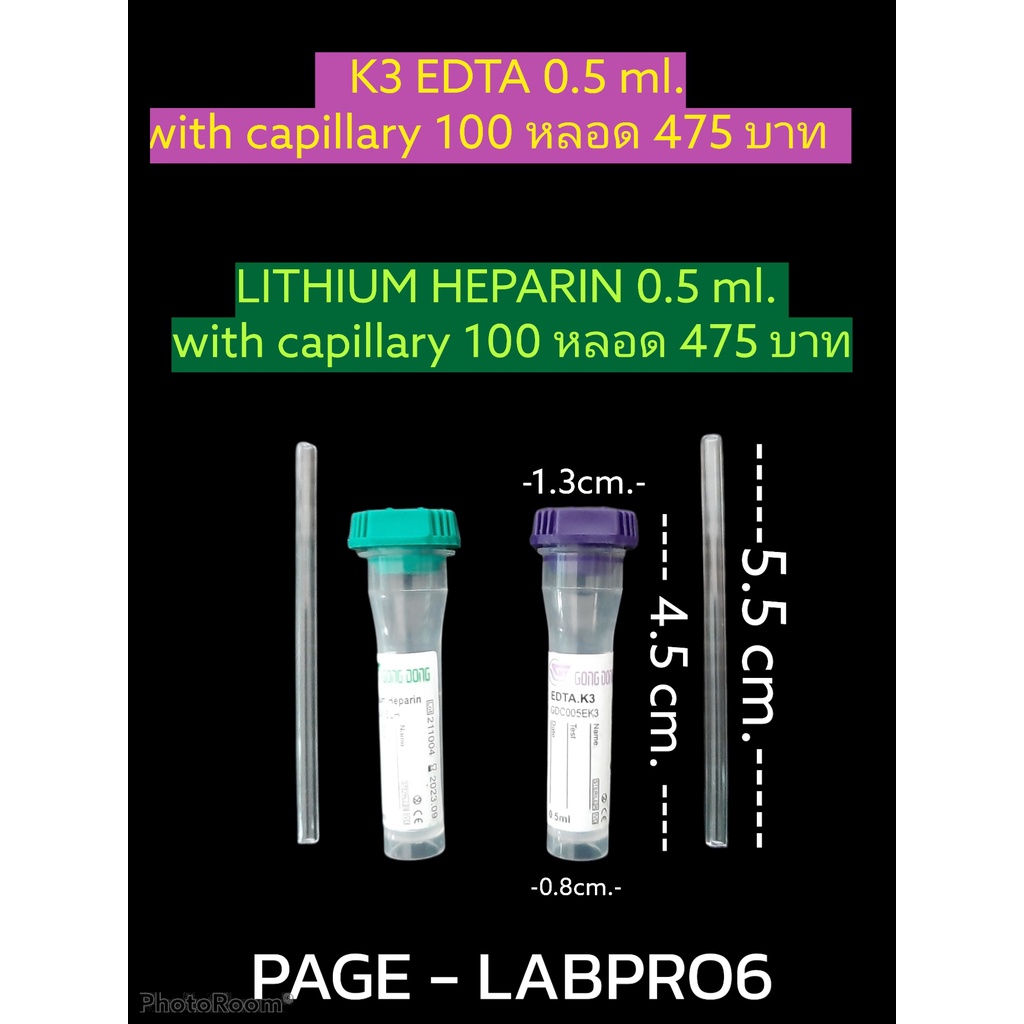 *10หลอด* หลอดเก็บตัวอย่าง K3 EDTA / LITHIUM HEPARIN ขนาดบรรจุ 0.5 มล. 10หลอด/ถุง *แบบมี CAPILLARY*