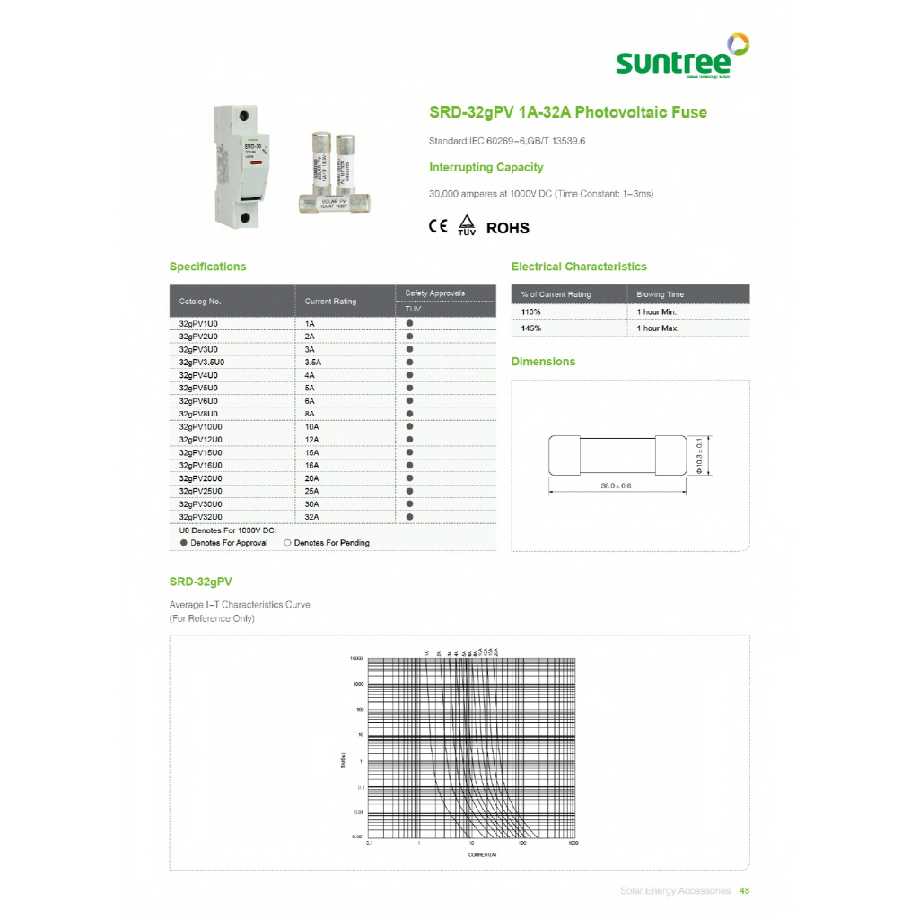 SRF-30 ( SRD-30 ) ฟิวส์กระเบื้อง ลูกฟิวส์ DC 1000V 10*38mm. (10A,16A,20A,25A,32A) DC Fuse Link Solar PV TUV ″SUNTREE"
