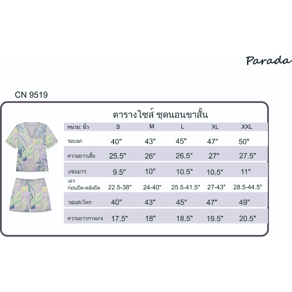 PARADA ชุดนอน CN9519 เสื้อ แบบสวมหัวคอวี+กางเกงขาสั้น ผ้าซาติน/SATIN พิมพ์ลาย เนื้อนุ่มลื่น เบา สบาย