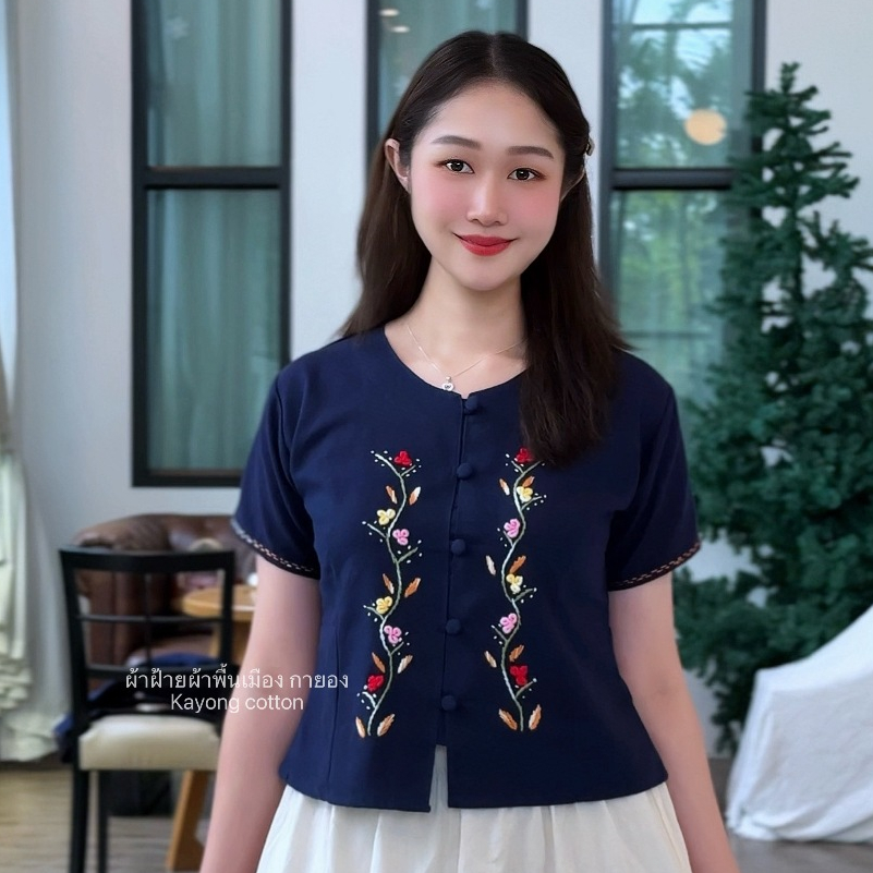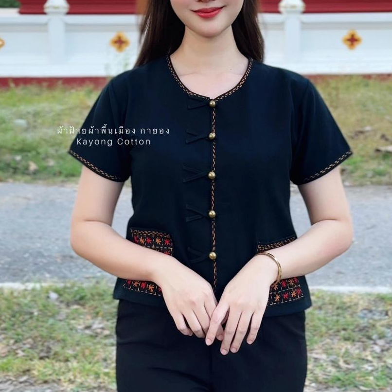 เสื้อผ้าฝ้ายงานปักมือ ปักกระเป๋า แต่งกระดุมเงิน Handmade