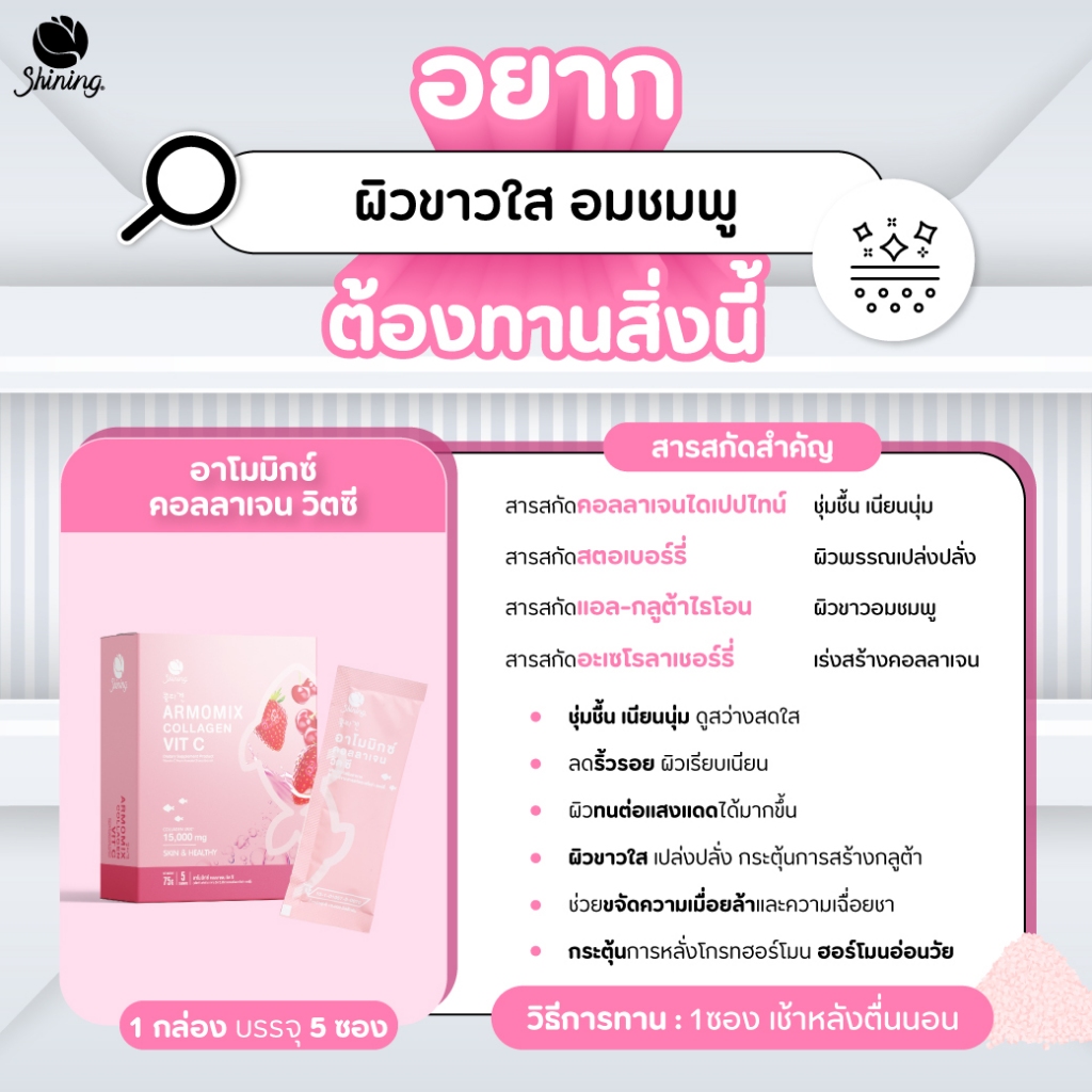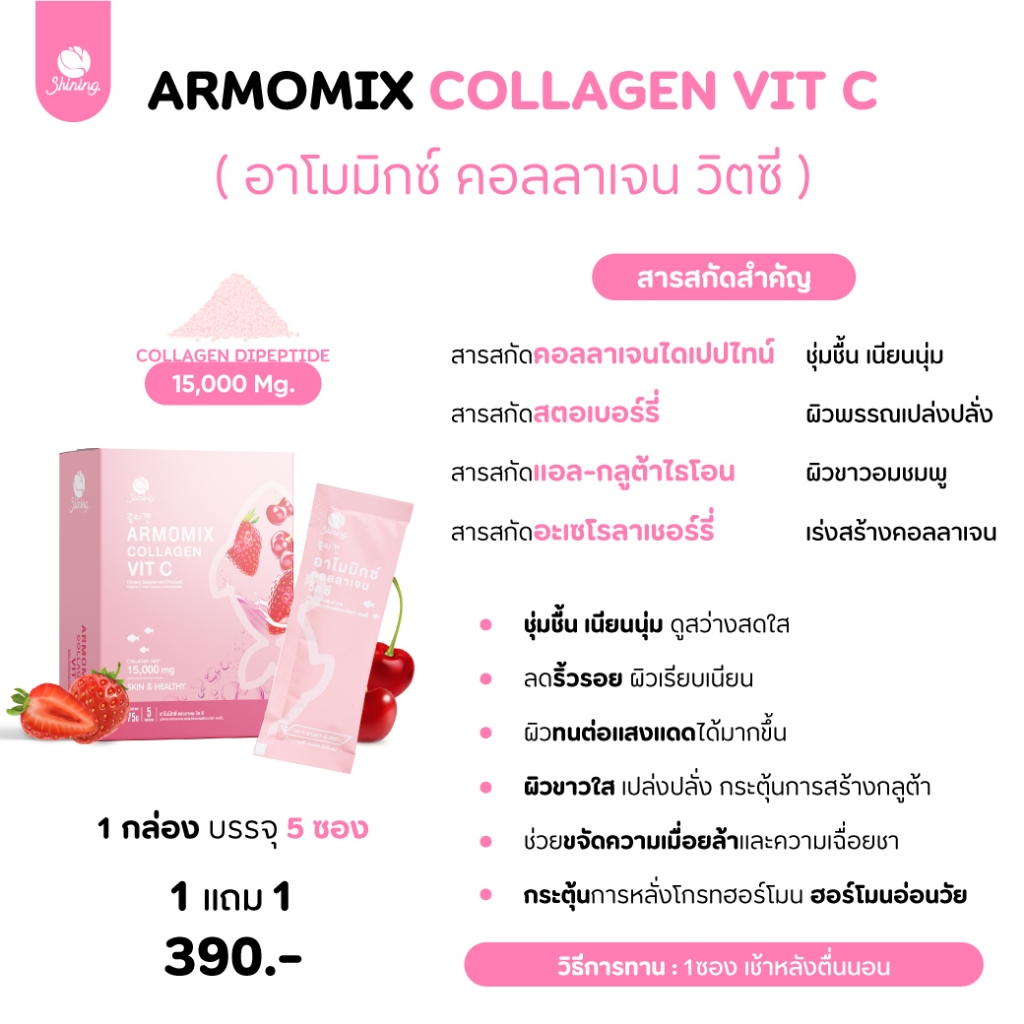 โปร 1 แถม 1 อาโมมิกซ์ คอลลาเจน วิตซี Armomix Collagen ผิวขาว กระจ่างใส สารสกัดอะเซโรล่า เชอร์รี่ แบรนด์ชายนิ่ง Shining