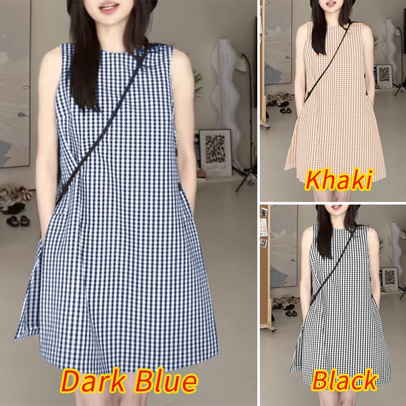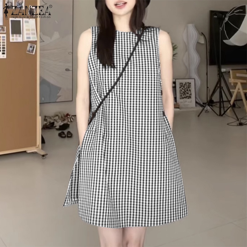 Zanzea ชุดเดรส คอกลม แขนกุด ลายสก๊อต มีกระเป๋าด้านข้าง สไตล์เกาหลี สําหรับผู้หญิง