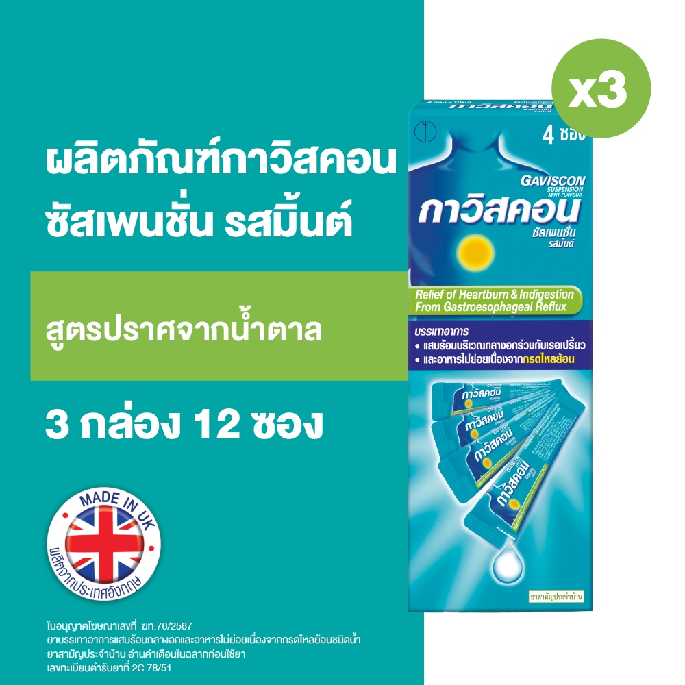 Gaviscon กาวิสคอน ซัสเพนชั่น รสมิ้นต์ ยาลดกรด กรดไหลย้อน สูตรมาตรฐาน 4 ซอง 10มล. X 3 กล่อง