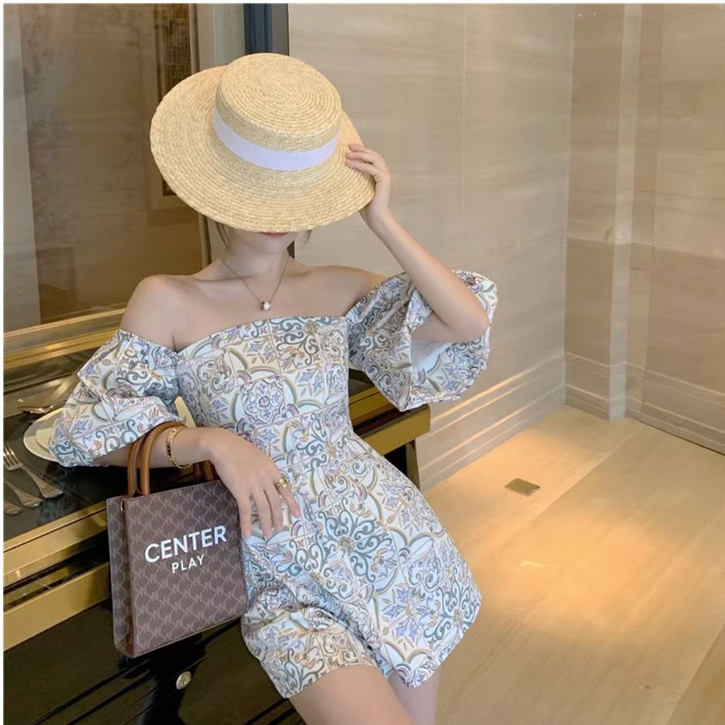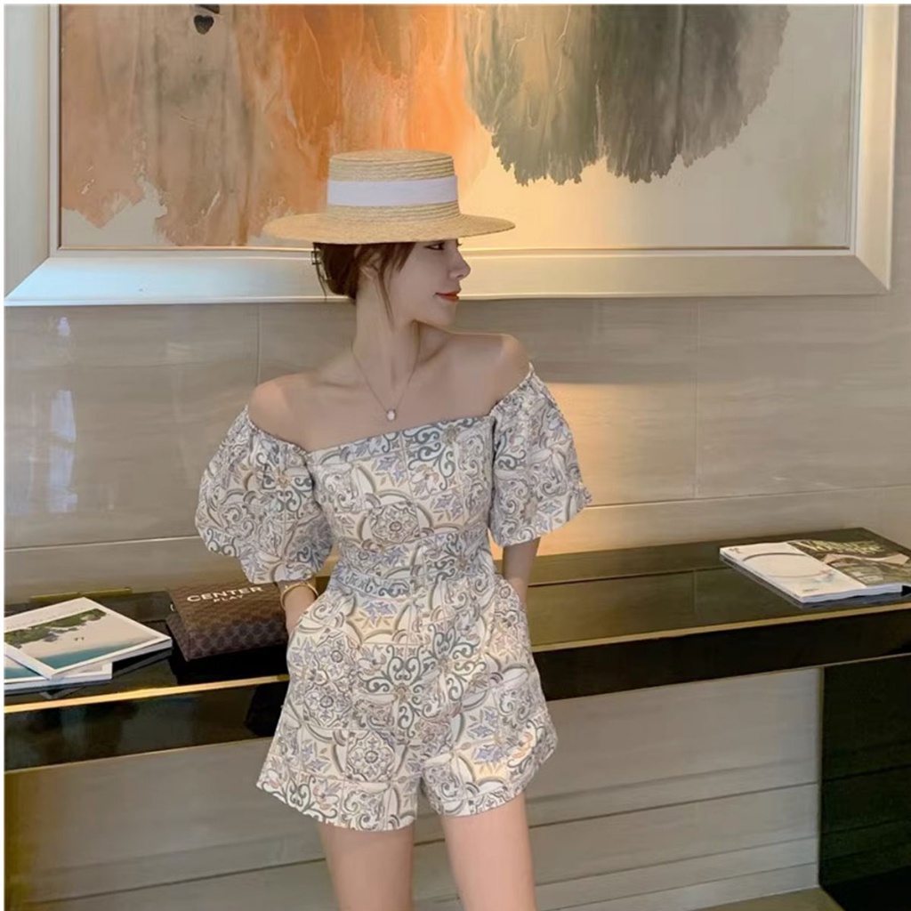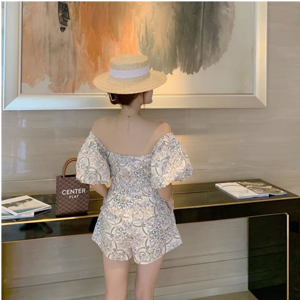 ชุดจั๊มขาสั้นพิมพ์ลายสุดวินเทจจั๊มสูท แขนพองผ้าทอลายดอก
