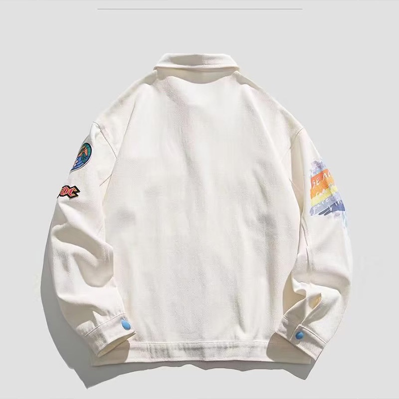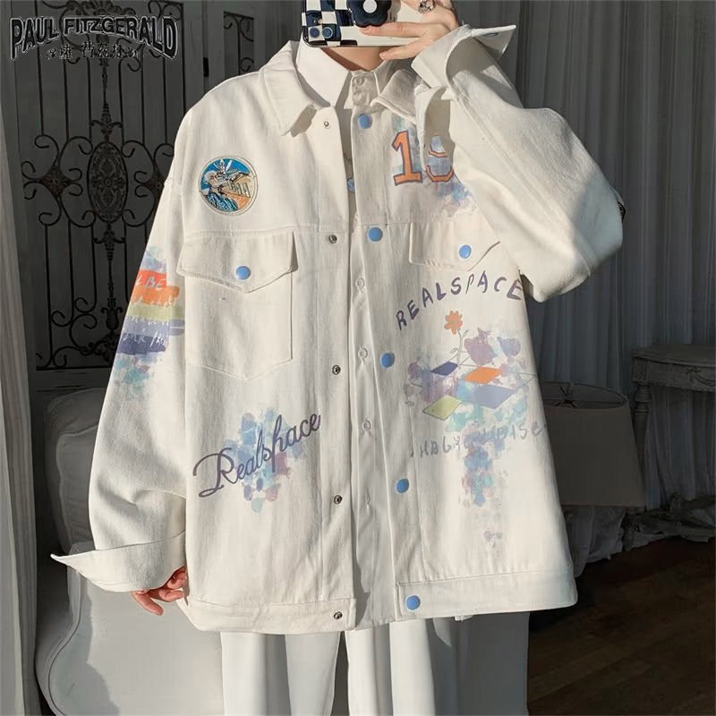 Paul Fitzgerald Graffiti เสื้อแจ็คเก็ตผู้ชายเวอร์ชั่นเกาหลีแฟชั่นใหม่การออกแบบหลวมความรู้สึกของการพิมพ์สีขั้นสูงLapel Denimเสื้อผ้านักเรียน