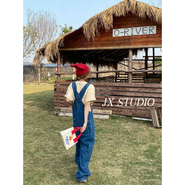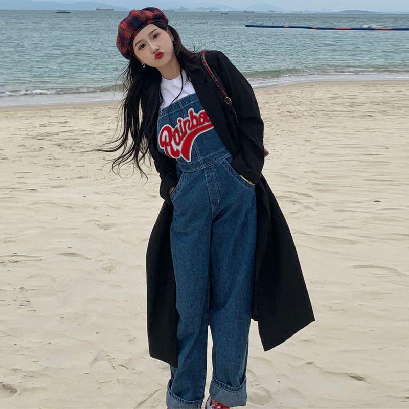 เอี๊ยมยีนส์ผู้หญิงขายาว ทรงหลวมOversize สไตล์เกาหลีลายปักเอวสูง รุ่น1108