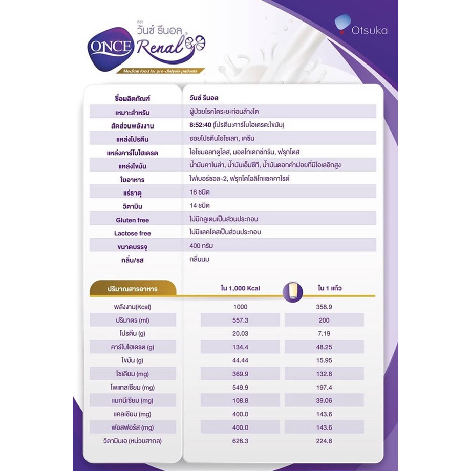 Once Renal 400g. วันซ์ รีนอล 400กรัม สำหรับผู้ป่วยโรคไตระยะก่อนล้างไต อาหารทางการแพทย์