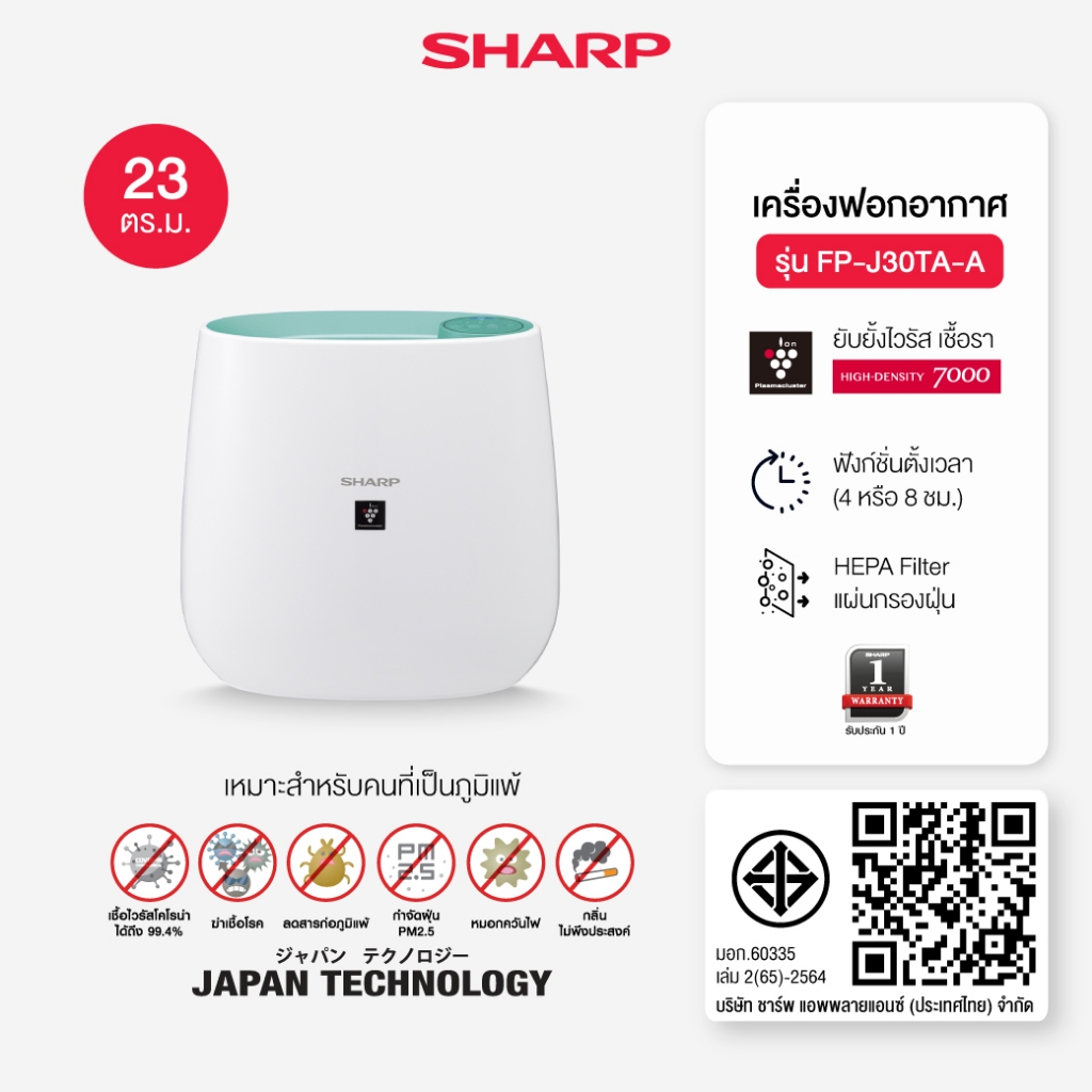 SHARP Air Purifier เครื่องฟอกอากาศพลาสม่าคลัสเตอร์ รุ่น FP-J30TA ขนาด 23 ตร.ม