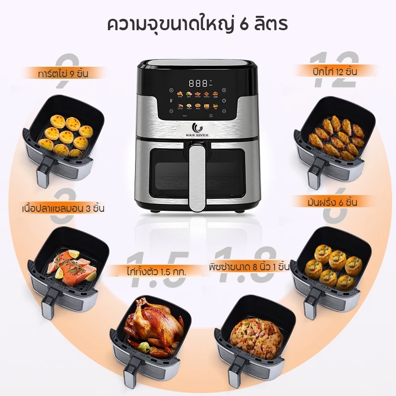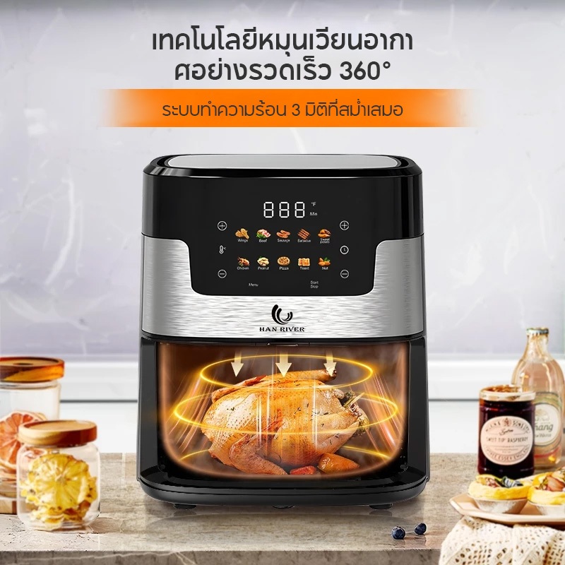 HAN RIVER หม้อทอดไร้น้ำมัน 8 ลิตร Air Fryer 1400W ปรับอุณหภูมิและเวลาได้ วัสดุสแตนเลสคุณภาพสูง